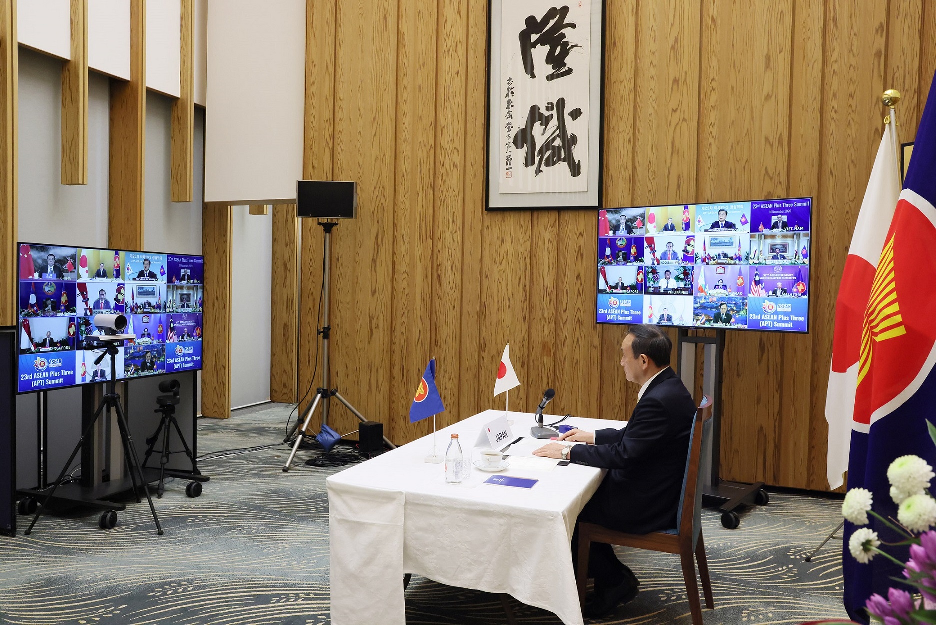 菅总理在总理大臣官邸出席了在线上举行的东盟和日中韩(ASEAN+3)首脑会议。