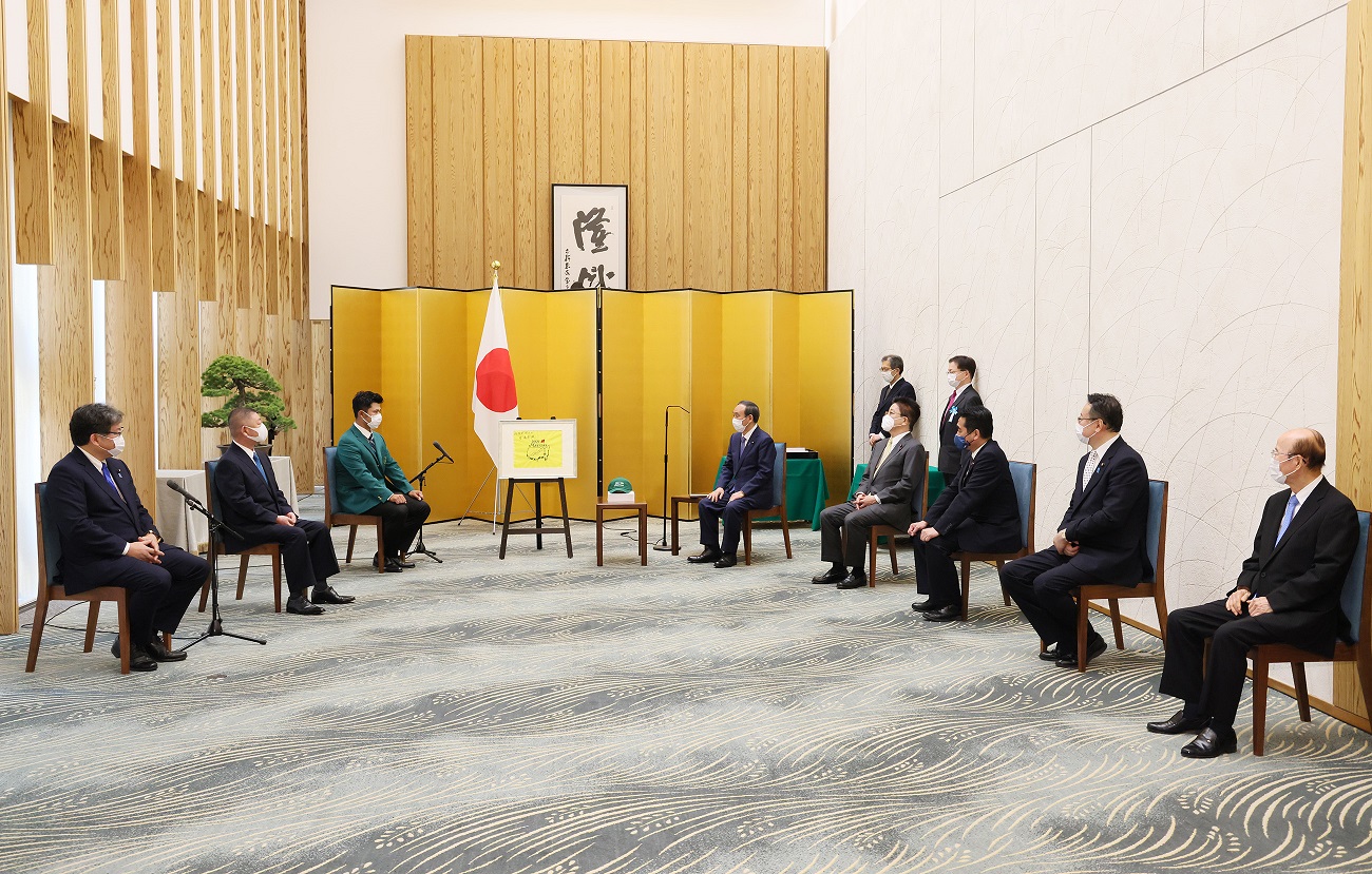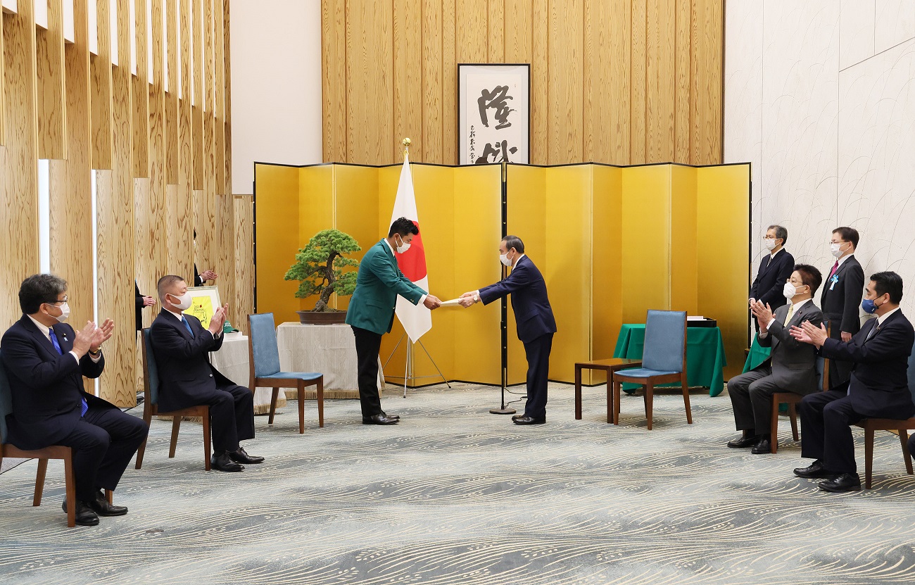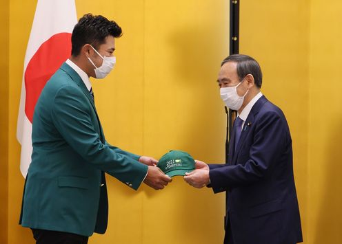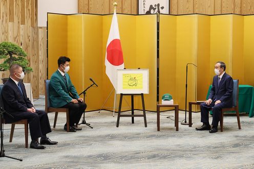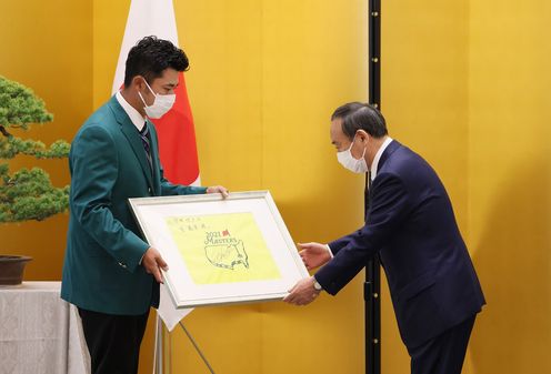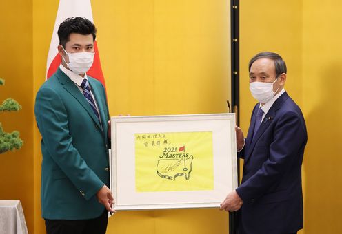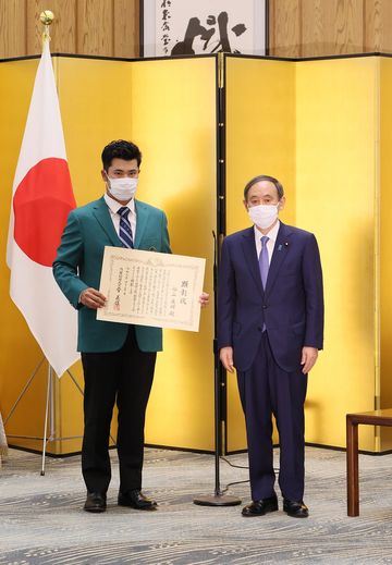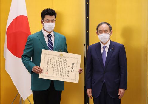 菅总理在总理大臣官邸举行了职业高尔夫选手松山英树的内阁总理大臣表彰仪式,向其授予了嘉奖状。