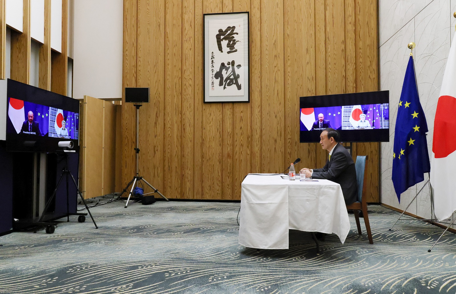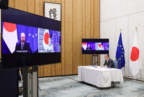 菅总理在总理大臣官邸出席了以线上方式举行的第27届日欧(欧盟)定期首脑磋商。