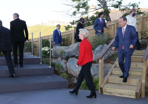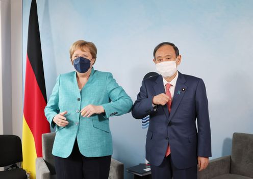 2021年6月12日(当地时间),为出席七国集团(G7)康沃尔峰会而访问了英国康沃尔的菅总理与德意志联邦共和国总理安格拉·默克尔举行了会谈。其后,出席了以更强劲的复苏、外交政策、卫生保健为主题的会议,并与法兰西共和国总统埃马纽埃尔·马克龙举行了会谈。
