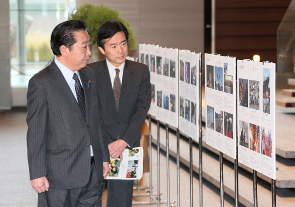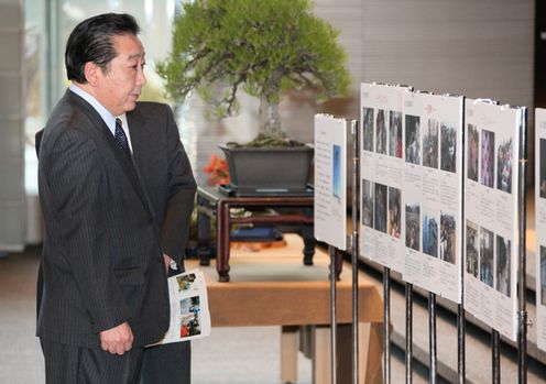 野田总理在总理大臣官邸入口参观了“我的复兴消息”展览。
