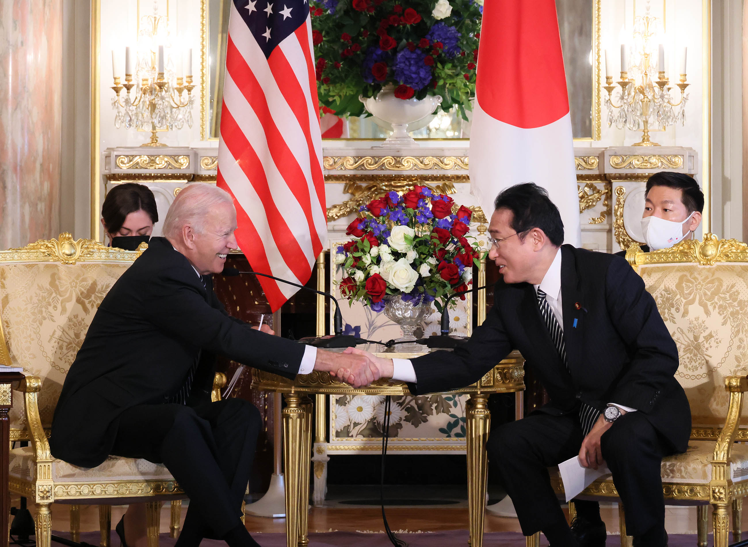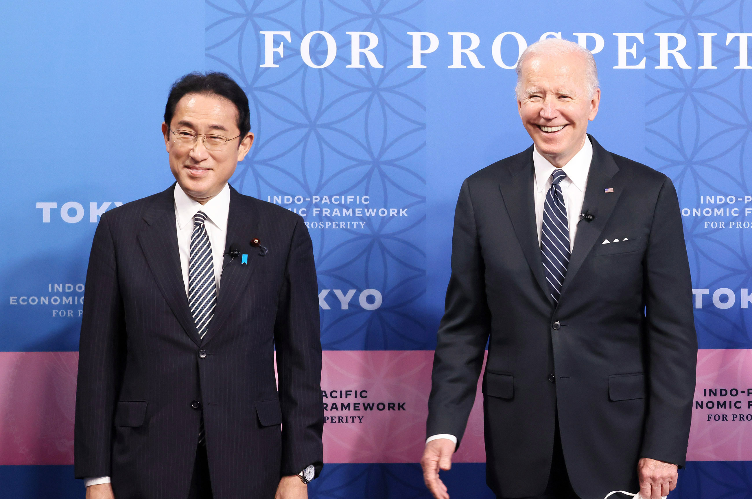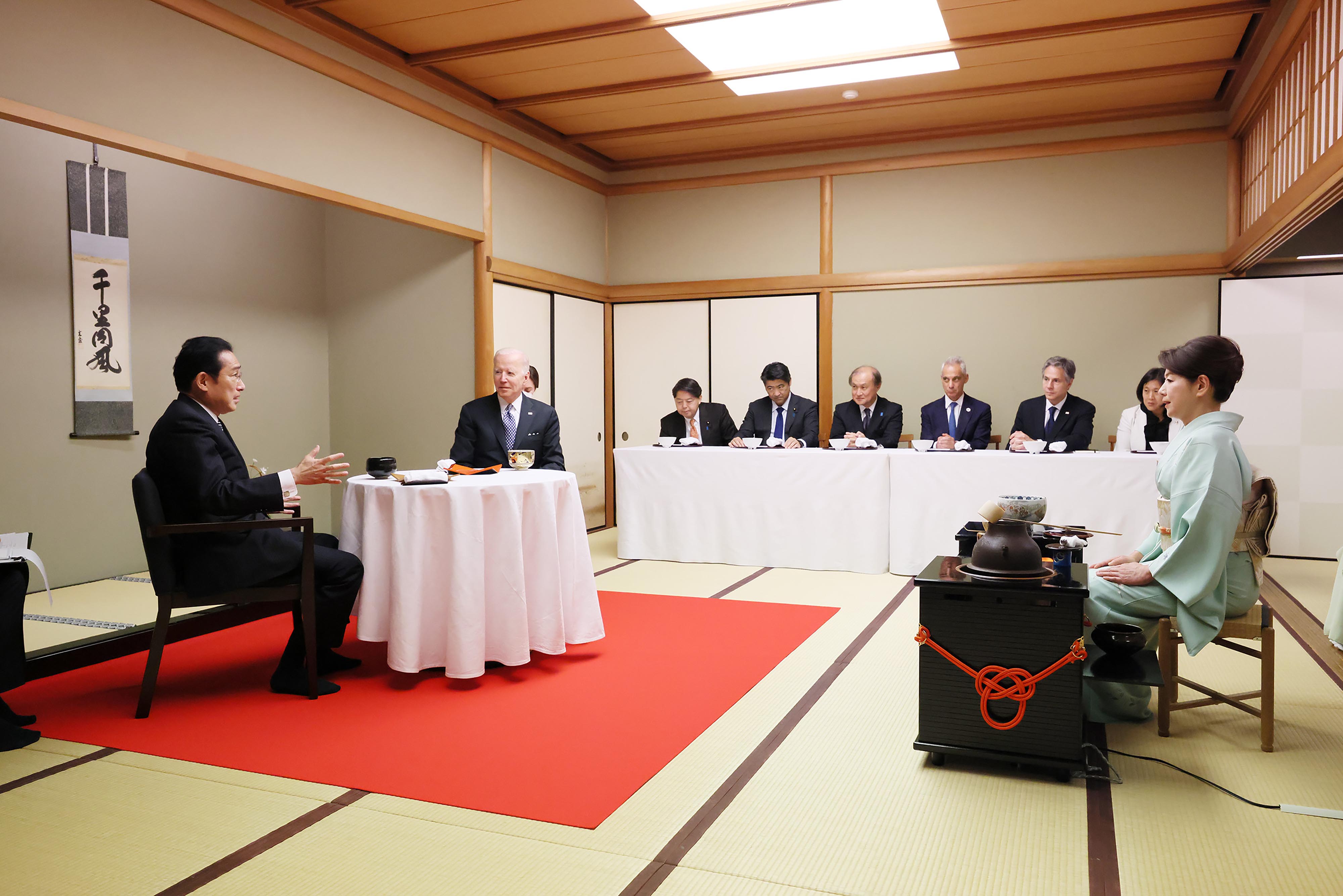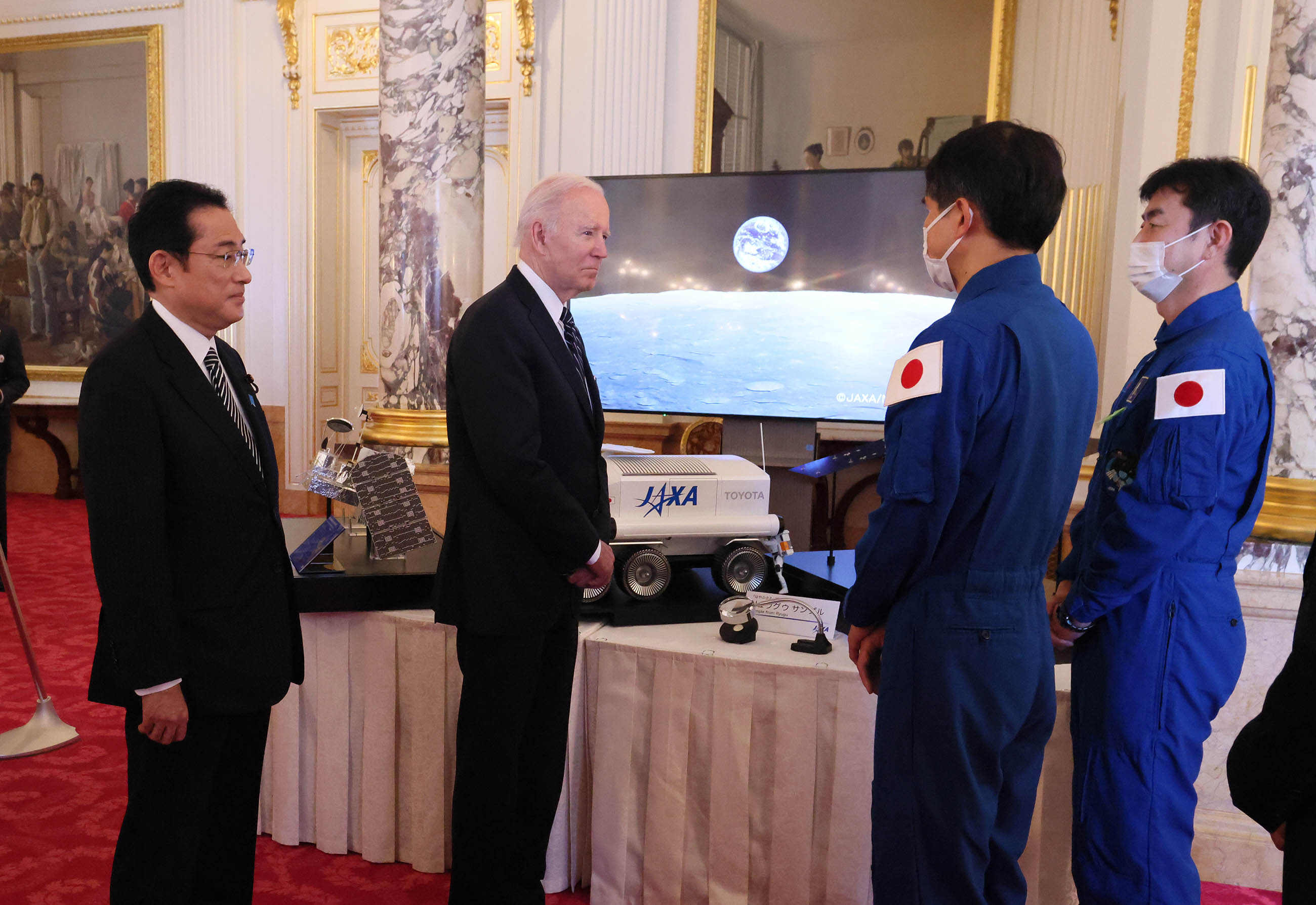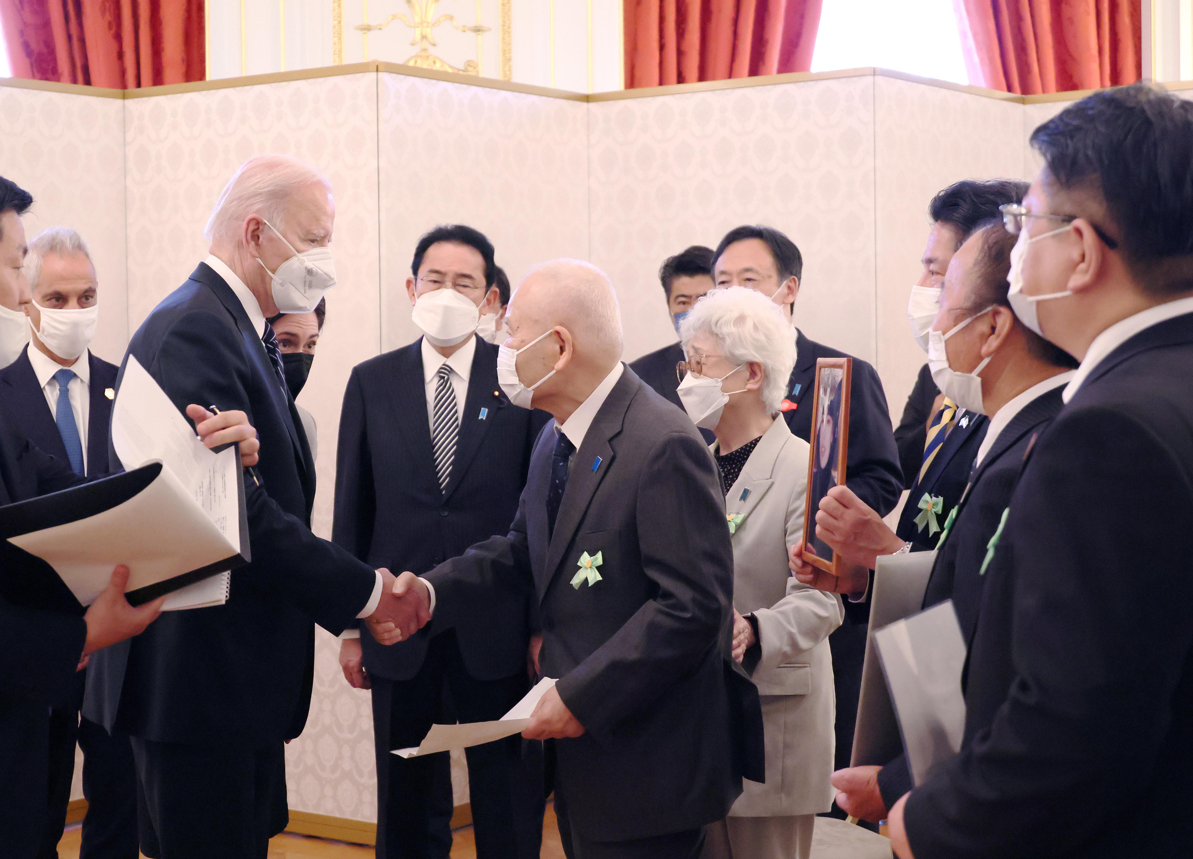 #外交・安全保障 #自由で開かれたインド太平洋 #日米首脳会談 #拉致問題 日米首脳会談等 更新日:令和4年5月23日 総理の一日 ツイート 写真撮影1 歓迎行事1 歓迎行事2 歓迎行事3 写真撮影2 写真撮影3 日米首脳会談1 日米首脳会談2 日米首脳会談3 日米宇宙協力関連展示1 日米宇宙協力関連展示2 日米宇宙協力関連展示3 日米共同記者会見1 日米共同記者会見2 日米共同記者会見3 日米共同記者会見4 拉致被害者御家族との面会1 拉致被害者御家族との面会2 拉致被害者御家族との面会3 IPEF(インド太平洋経済枠組み)関連行事1 IPEF(インド太平洋経済枠組み)関連行事2 IPEF(インド太平洋経済枠組み)関連行事3 IPEF(インド太平洋経済枠組み)関連行事4 IPEF(インド太平洋経済枠組み)関連行事5 IPEF(インド太平洋経済枠組み)関連行事6 非公式夕食会に臨む両首脳1 非公式夕食会に臨む両首脳2 総理夫人によるお点前1 総理夫人によるお点前2 総理夫人によるお点前3 関連動画開く閉じる 動画が再生できない方はこちら(政府広報オンライン) 令和4年5月23日、岸田総理は、迎賓館赤坂離宮でアメリカ合衆国のジョセフ・バイデン大統領と首脳会談等を行いました。 両首脳は、会談を行い、続いて日米宇宙協力関連展示を視察しました。その後、共同記者会見を行い、続いて拉致被害者御家族と面会しました。 次に、都内でIPEF(インド太平洋経済枠組み)関連行事に出席し、夜には、非公式夕食会を行いました。
