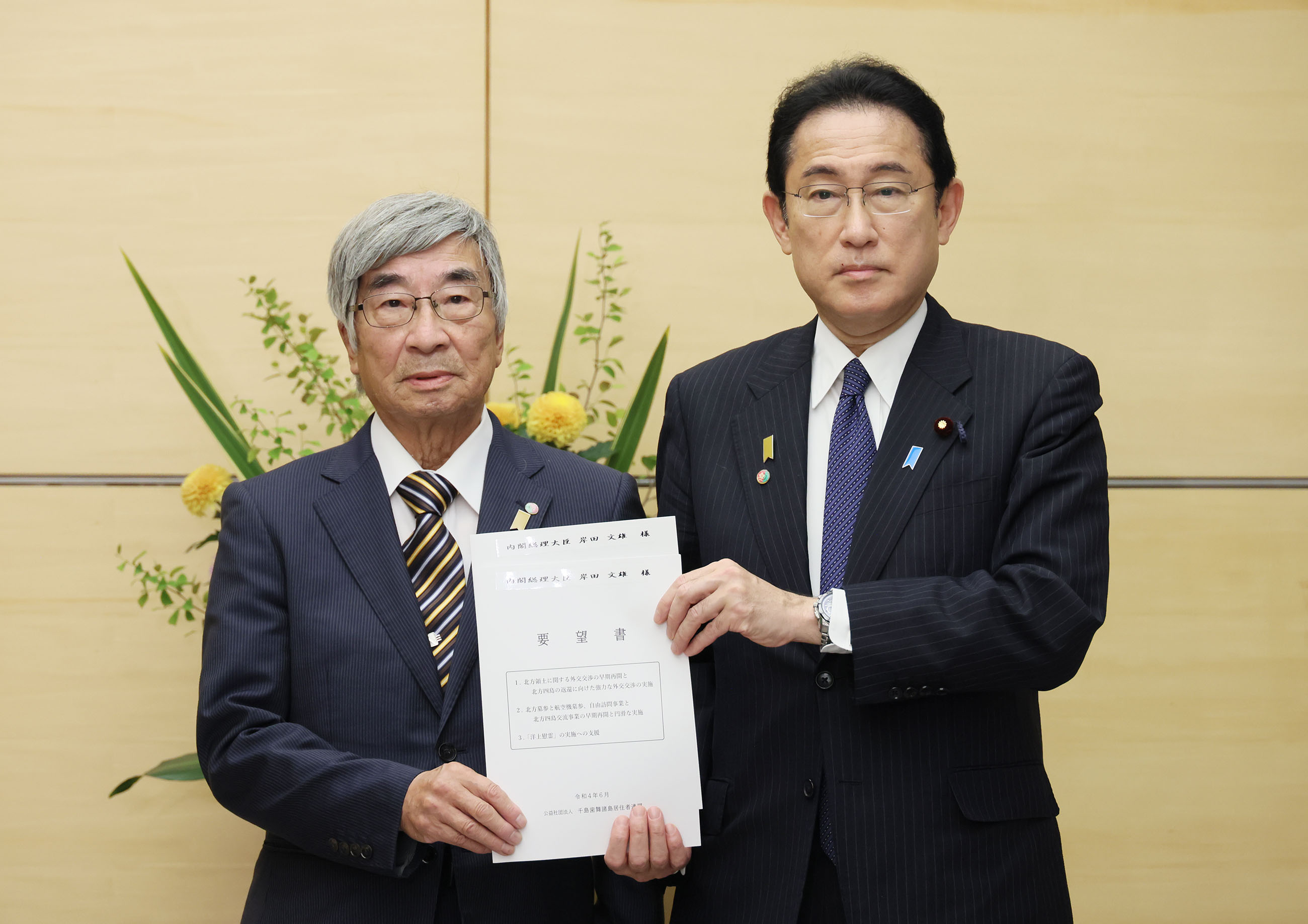 #北方領土 #外交・安全保障 北海道知事等による北方領土問題の解決等に関する要請 更新日:令和4年6月2日 総理の一日 ツイート 要請を受ける岸田総理1 要請を受ける岸田総理2 要請を受ける岸田総理3 要請を受ける岸田総理4 発言する岸田総理1 発言する岸田総理2 関連動画開く閉じる 動画が再生できない方はこちら(政府広報オンライン) 令和4年6月2日、岸田総理は、総理大臣官邸で北海道の鈴木直道知事等による北方領土問題の解決等に関する要請を受けました。