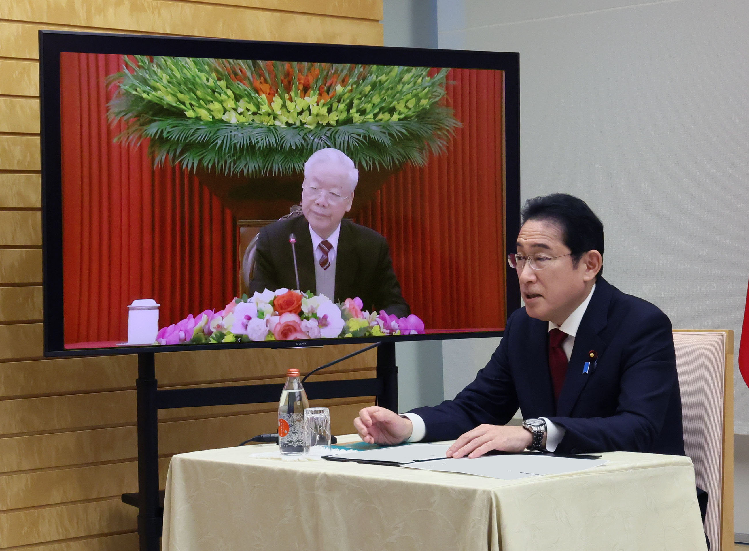 #外交・安全保障 チョン・ベトナム共産党書記長とのテレビ会談 更新日:令和5年2月9日 総理の一日 ツイート チョン・ベトナム共産党書記長とテレビ会談を行う岸田総理1 チョン・ベトナム共産党書記長とテレビ会談を行う岸田総理2 チョン・ベトナム共産党書記長とテレビ会談を行う岸田総理3 令和5年2月9日、岸田総理は、総理大臣官邸でベトナム社会主義共和国のグエン・フー・チョン共産党書記長とテレビ会談を行いました。