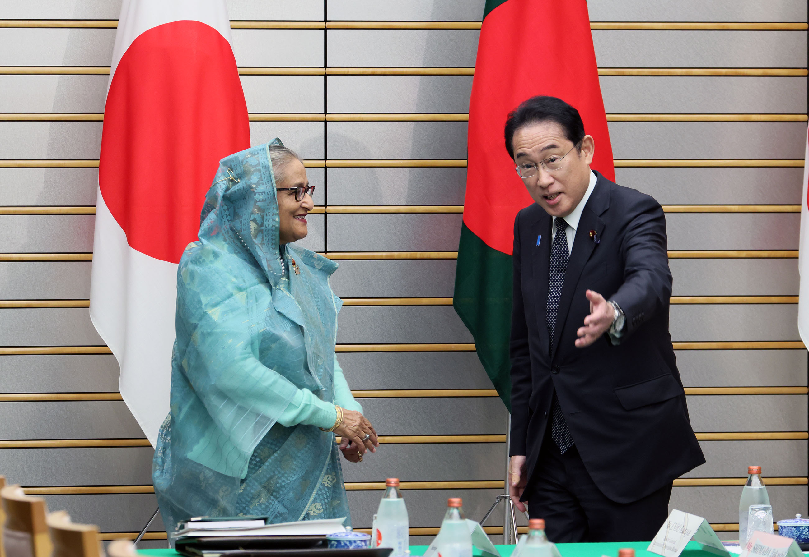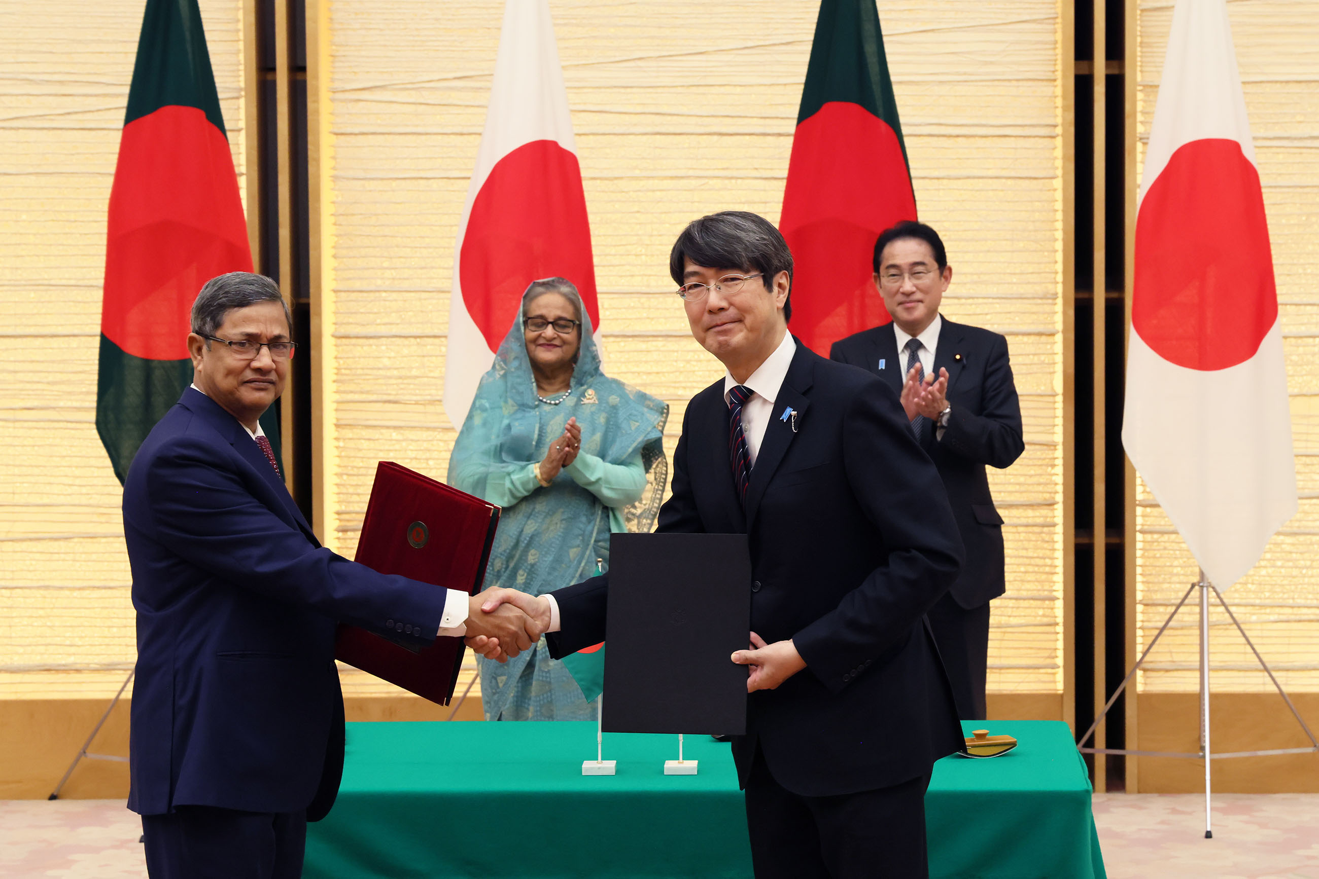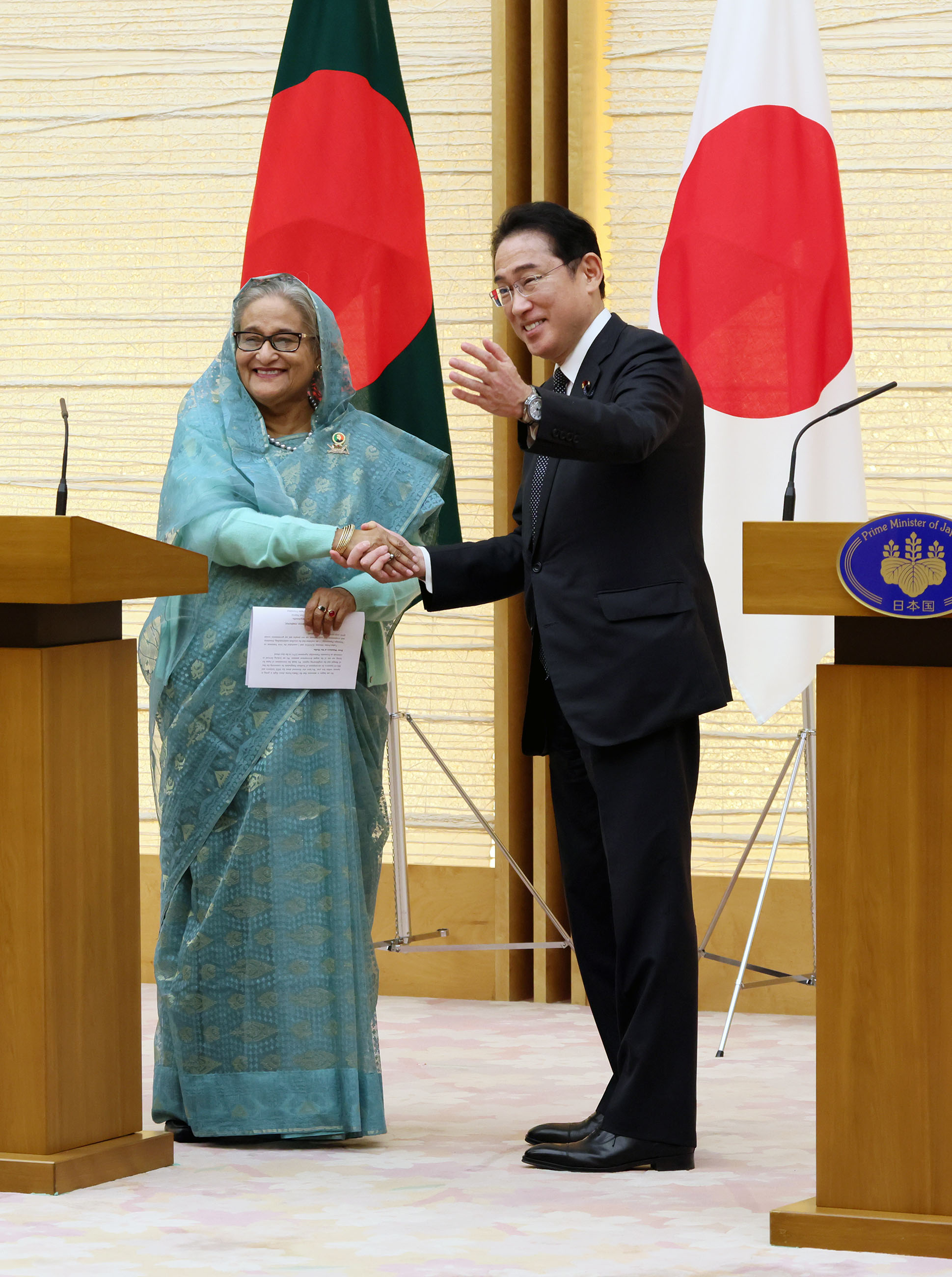 #外交・安全保障 #日・バングラデシュ首脳会談 日・バングラデシュ首脳会談等 更新日:令和5年4月26日 総理の一日 ツイート 握手を交わす両首脳 ハシナ・バングラデシュ首相を迎える岸田総理 儀じょう隊による儀礼1 儀じょう隊による儀礼2 儀じょう隊による儀礼3 日・バングラデシュ首脳会談1 日・バングラデシュ首脳会談2 日・バングラデシュ首脳会談3 日・バングラデシュ首脳会談4 文書交換式1 文書交換式2 文書交換式3 文書交換式4 文書交換式5 文書交換式6 文書交換式7 文書交換式8 文書交換式9 文書交換式10 文書交換式11 文書交換式12 文書交換式13 文書交換式14 文書交換式15 共同記者発表1 共同記者発表2 共同記者発表3 共同記者発表4 共同記者発表5 関連動画開く閉じる 動画が再生できない方はこちら(政府広報オンライン) 令和5年4月26日、岸田総理は、総理大臣官邸でバングラデシュ人民共和国のシェイク・ハシナ首相と首脳会談等を行いました。 儀じょう隊による儀礼に続き、両首脳は会談を行い、その後、文書交換式及び共同記者発表を行いました。