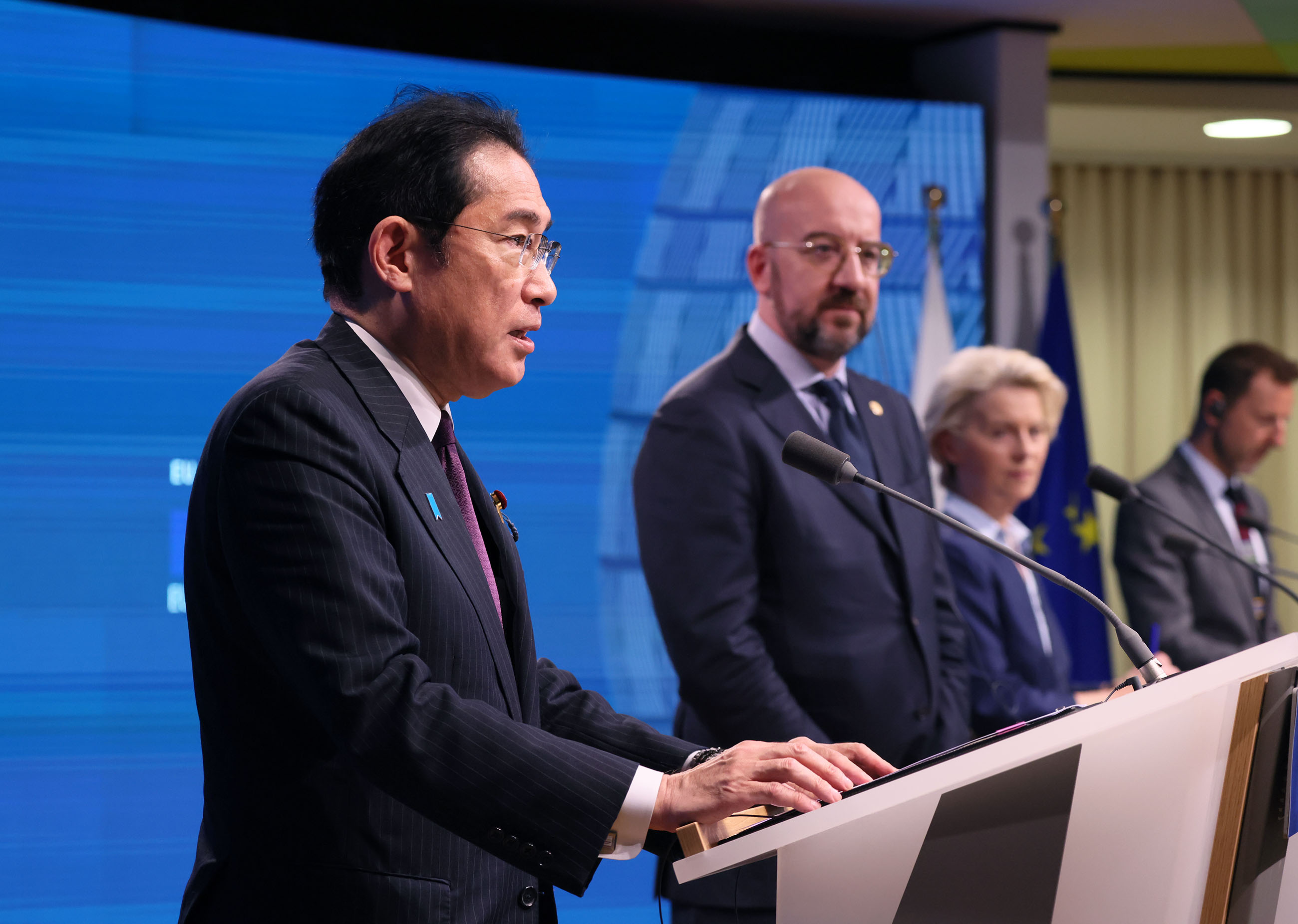 #外交・安全保障 #日・ベルギー首脳会談 #EU ベルギー訪問 更新日:令和5年7月13日 総理の一日 ツイート ミシェル欧州理事会議長及びフォン・デア・ライエン欧州委員会委員長による出迎えを受ける岸田総理1 ベルギーに到着する岸田総理1 ベルギーに到着する岸田総理2 ドゥ=クローベルギー首相による出迎えを受ける岸田総理1 ドゥ=クローベルギー首相による出迎えを受ける岸田総理2 日・ベルギー首脳会談に臨む岸田総理 日・ベルギー首脳会談1 日・ベルギー首脳会談2 日・ベルギー首脳会談3 日・ベルギー首脳会談4 ミシェル欧州理事会議長及びフォン・デア・ライエン欧州委員会委員長による出迎えを受ける岸田総理2 ワーキングランチ1 ワーキングランチ2 ワーキングランチ3 ワーキングランチ4 共同記者会見1 共同記者会見2 共同記者会見3 共同記者会見4 共同記者会見5 共同記者会見6 共同記者会見7 関連動画開く閉じる 動画が再生できない方はこちら(政府広報オンライン) 令和5年7月12日(現地時間)、岸田総理は、ベルギー王国のブリュッセルを訪問しました。 翌13日(現地時間)、総理は、ベルギー王国のアレクサンダー・ドゥ=クロー首相と会談を行い、次に、EU(欧州連合)のシャルル・ミシェル欧州理事会議長及びウァズラ・フォン・デア・ライエン欧州委員会委員長とワーキングランチを行い、その後、日EU定期首脳協議及び共同記者会見を行いました。