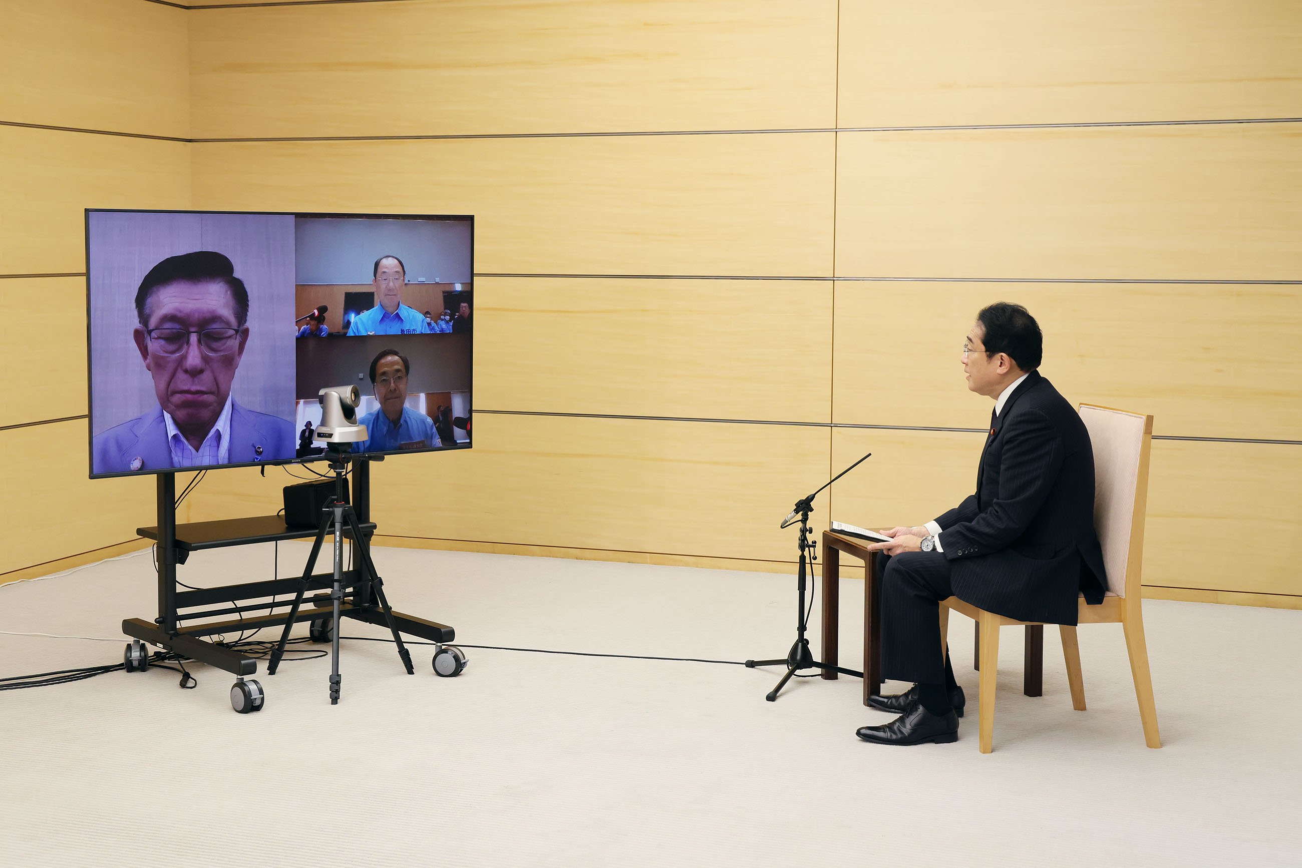 令和5年7月26日、岸田総理は、総理大臣官邸で秋田県の佐竹敬久(さたけ のりひさ)知事、秋田市の穂積志(ほづみ もとむ)市長と大雨災害に関するオンライン意見交換を行いました。