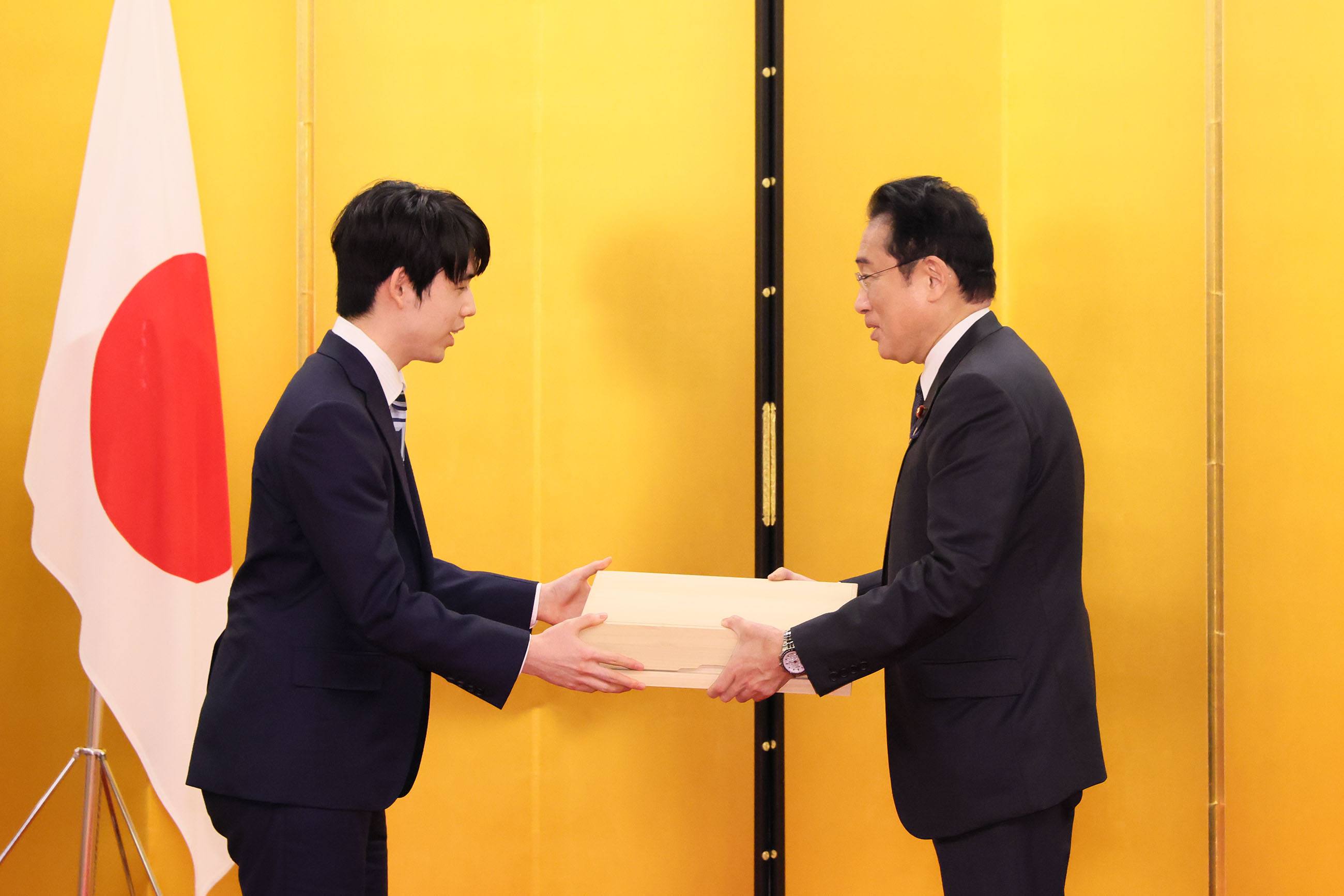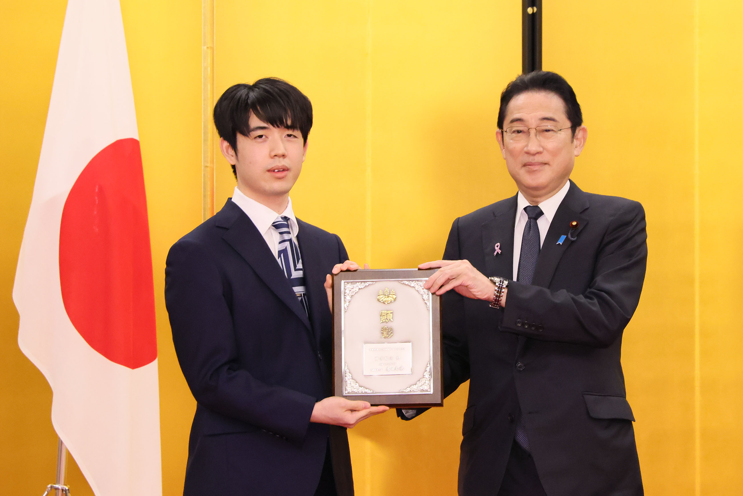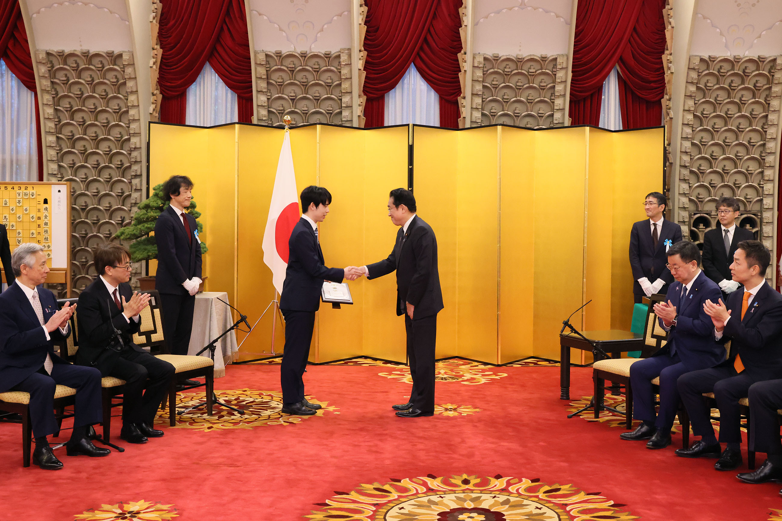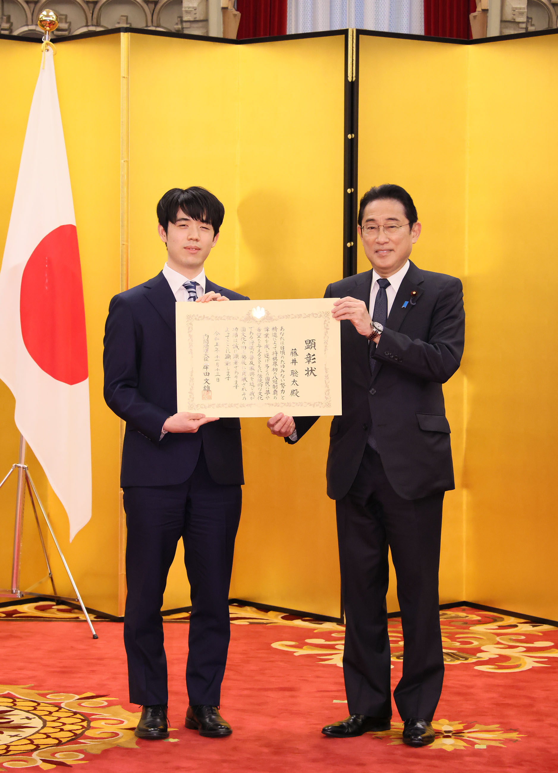 内閣総理大臣顕彰式 更新日:令和5年11月13日 総理の一日 ツイート 顕彰状を授与する岸田総理1 顕彰状を授与する岸田総理2 顕彰状を授与する岸田総理3 盾を授与する岸田総理1 盾を授与する岸田総理2 盾を授与する岸田総理3 返礼品を受け取る岸田総理1 返礼品を受け取る岸田総理2 返礼品を受け取る岸田総理3 懇談する岸田総理1 懇談する岸田総理2 関連動画開く閉じる 動画が再生できない方はこちら(政府広報オンライン) 令和5年11月13日、岸田総理は、総理大臣公邸で将棋棋士の藤井聡太(ふじい そうた)氏に対する内閣総理大臣顕彰式を行い、顕彰状及び盾を授与しました。