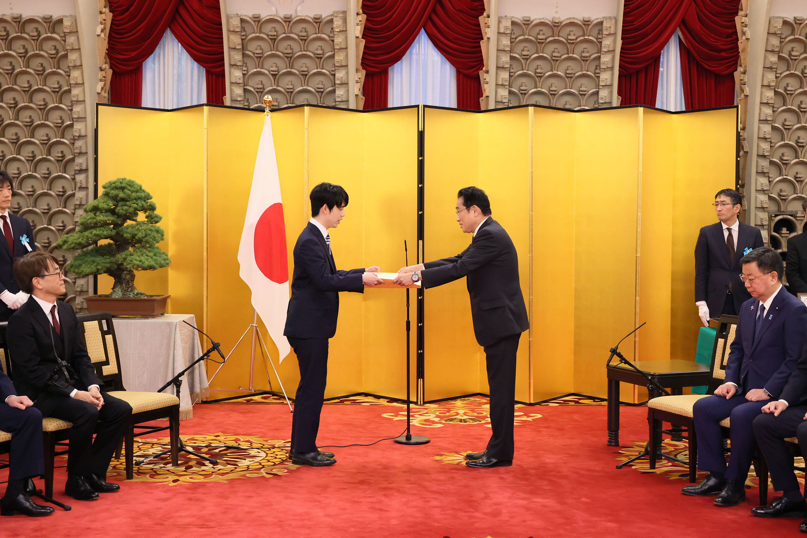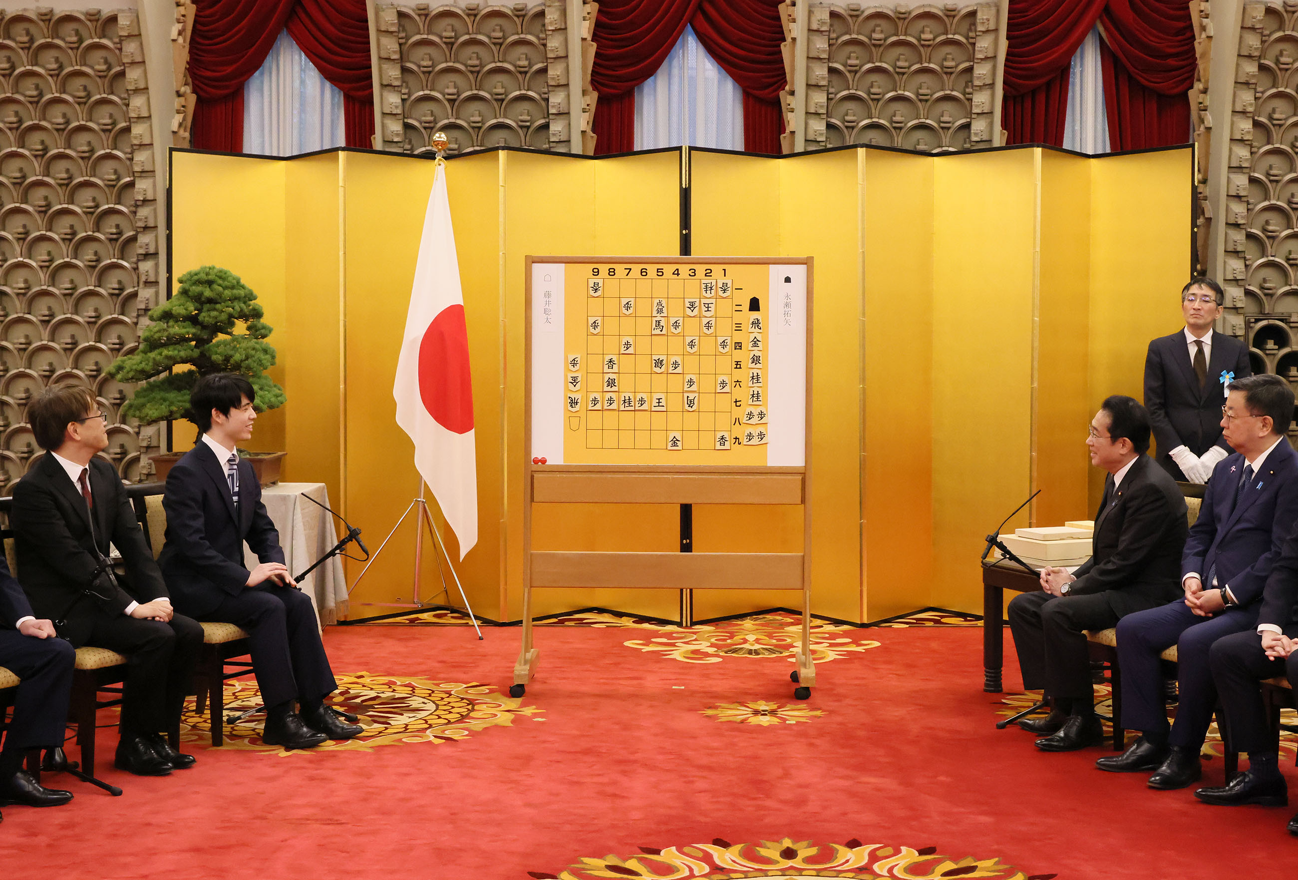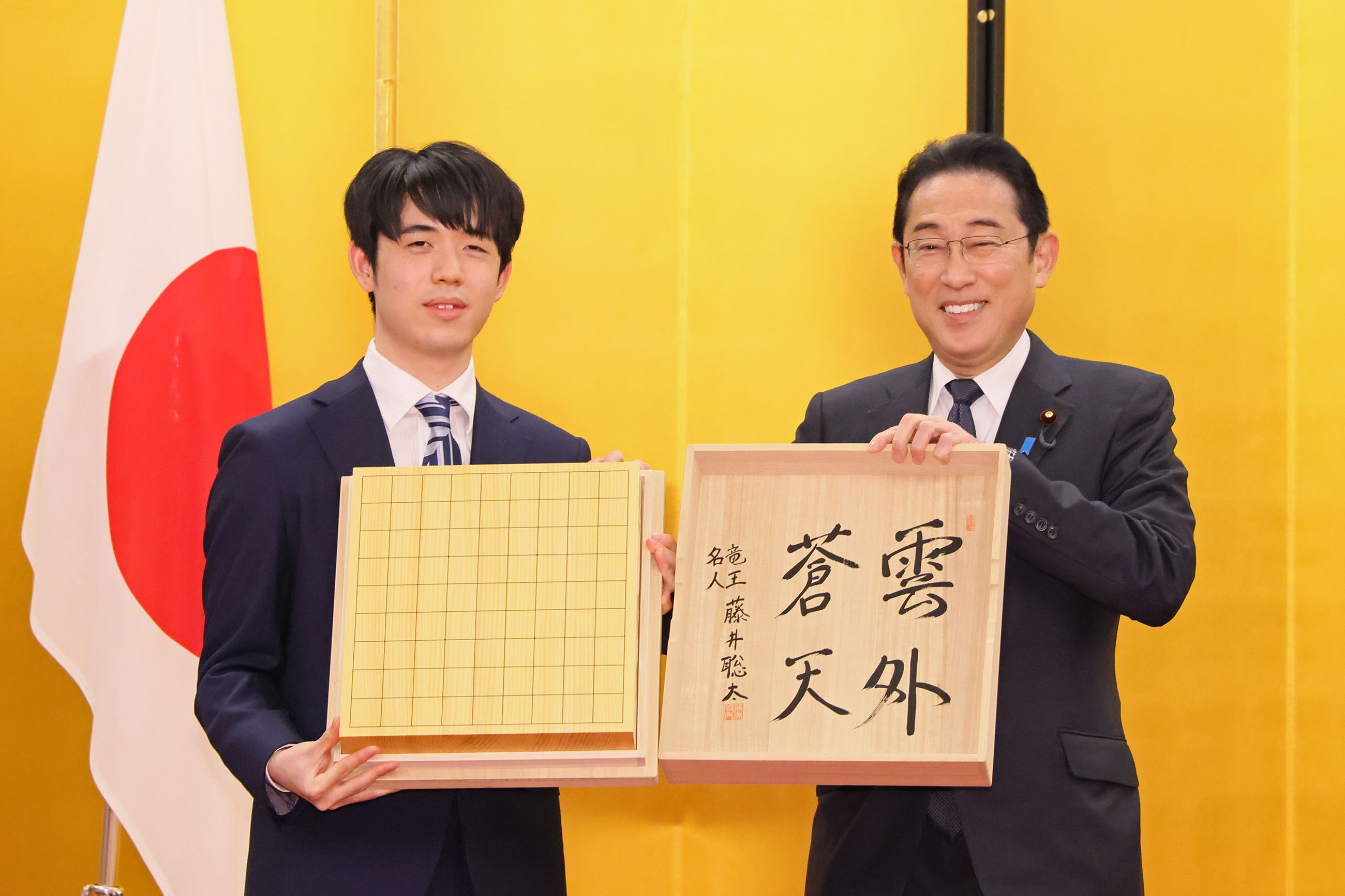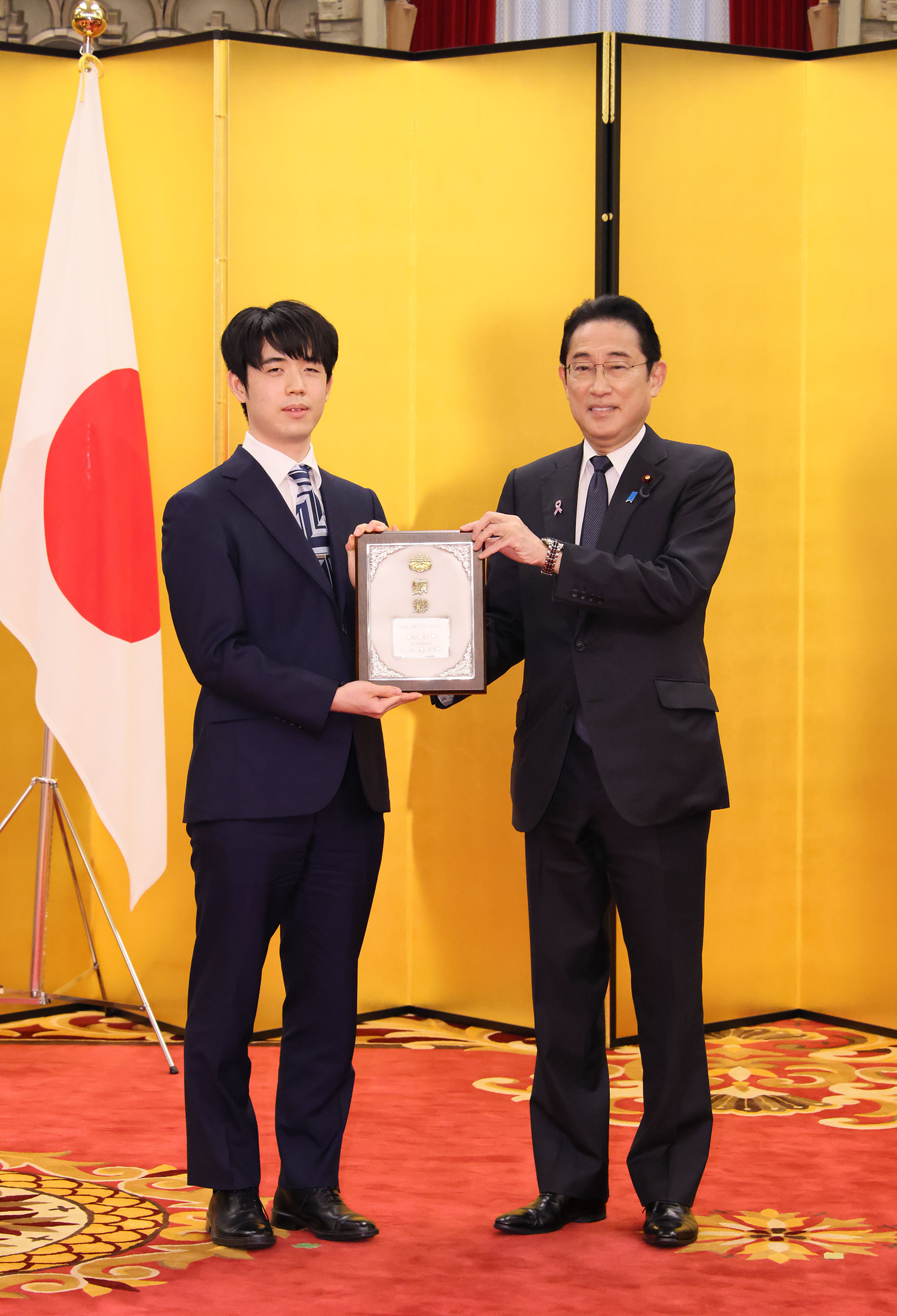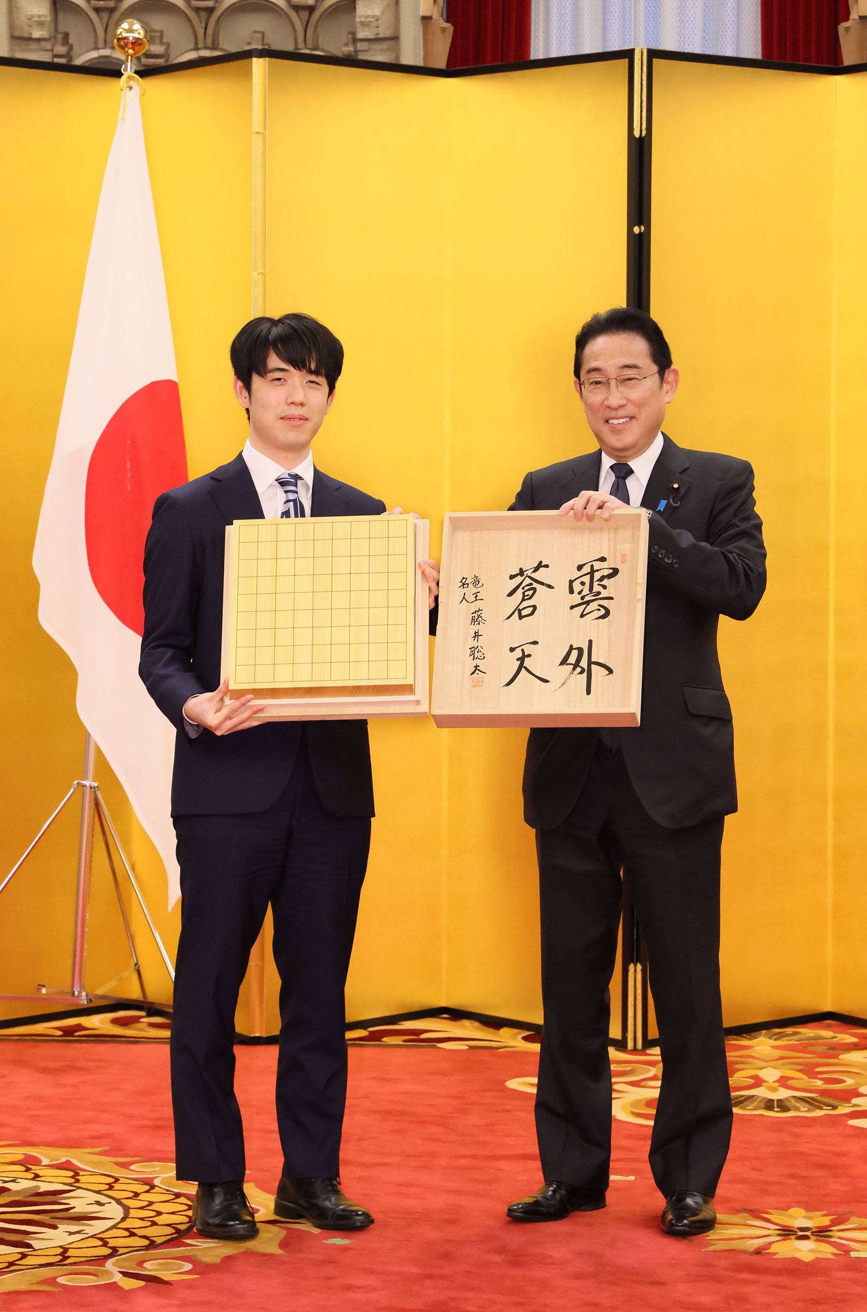 内閣総理大臣顕彰式 更新日:令和5年11月13日 総理の一日 ツイート 顕彰状を授与する岸田総理1 顕彰状を授与する岸田総理2 顕彰状を授与する岸田総理3 盾を授与する岸田総理1 盾を授与する岸田総理2 盾を授与する岸田総理3 返礼品を受け取る岸田総理1 返礼品を受け取る岸田総理2 返礼品を受け取る岸田総理3 懇談する岸田総理1 懇談する岸田総理2 関連動画開く閉じる 動画が再生できない方はこちら(政府広報オンライン) 令和5年11月13日、岸田総理は、総理大臣公邸で将棋棋士の藤井聡太(ふじい そうた)氏に対する内閣総理大臣顕彰式を行い、顕彰状及び盾を授与しました。