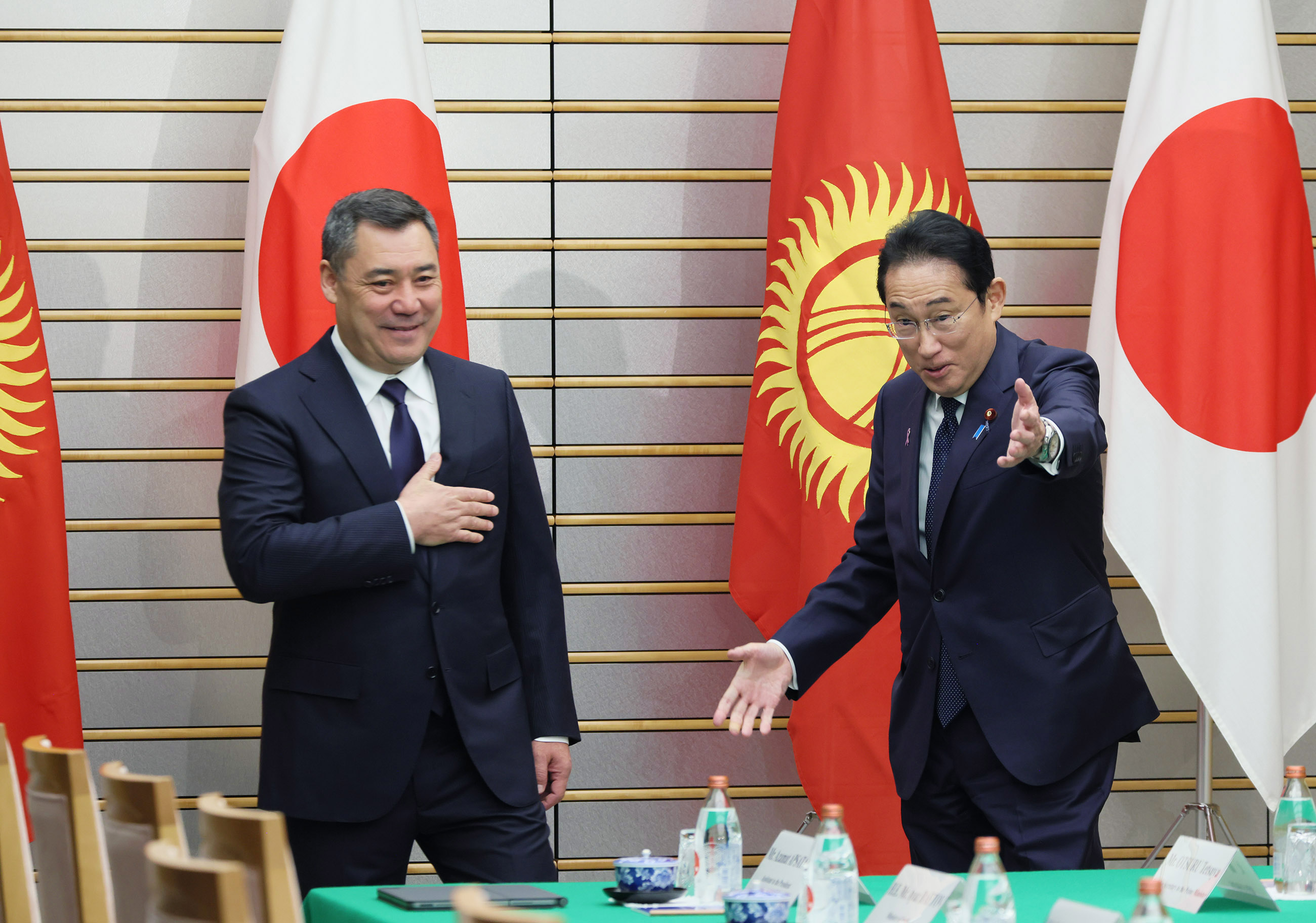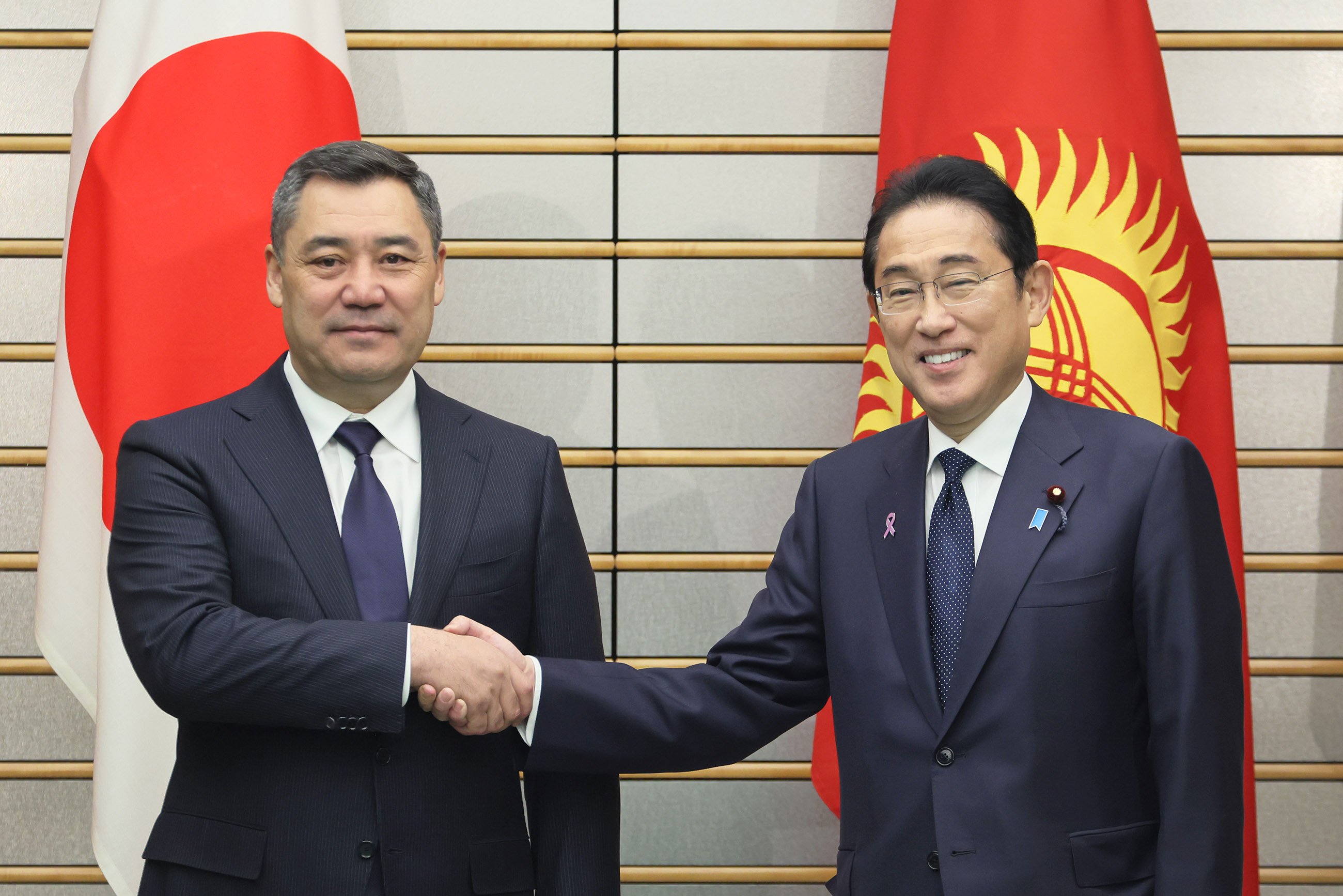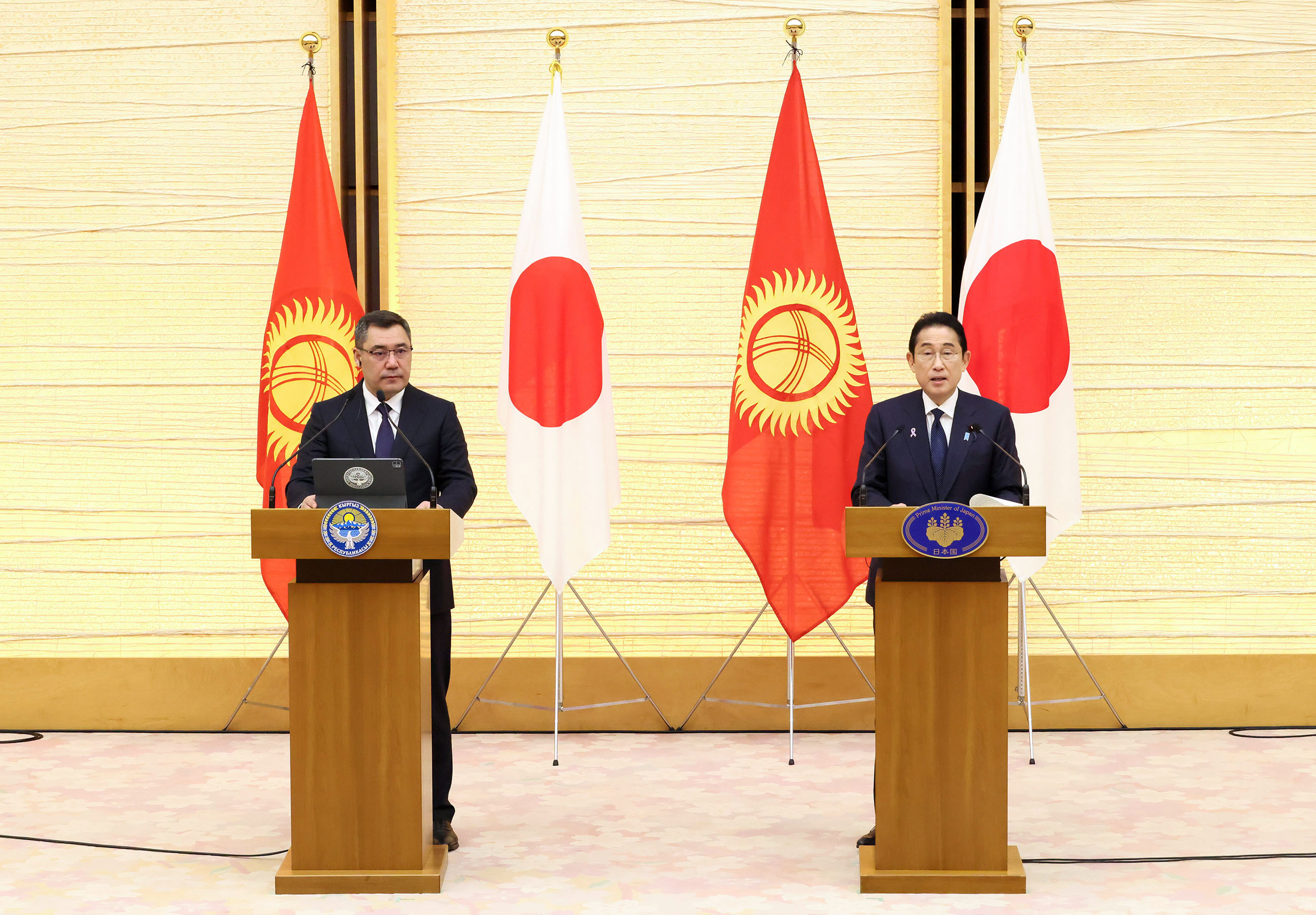 #外交・安全保障 #日・キルギス首脳会談 日・キルギス首脳会談等 更新日:令和5年11月20日 総理の一日 ツイート 日・キルギス首脳会談1 儀じょう隊による儀礼1 儀じょう隊による儀礼2 儀じょう隊による儀礼3 儀じょう隊による儀礼4 日・キルギス首脳会談2 日・キルギス首脳会談3 日・キルギス首脳会談4 日・キルギス首脳会談5 日・キルギス首脳会談6 署名式・文書交換式1 署名式・文書交換式2 署名式・文書交換式3 署名式・文書交換式4 署名式・文書交換式5 署名式・文書交換式6 共同記者発表1 共同記者発表2 共同記者発表3 共同記者発表4 関連動画開く閉じる 動画が再生できない方はこちら(政府広報オンライン) 令和5年11月20日、岸田総理は、総理大臣官邸でキルギス共和国のサディル・ジャパロフ大統領と首脳会談等を行いました。 儀じょう隊による儀礼に続き、両首脳は会談を行い、その後、署名式・文書交換式及び共同記者発表を行いました。