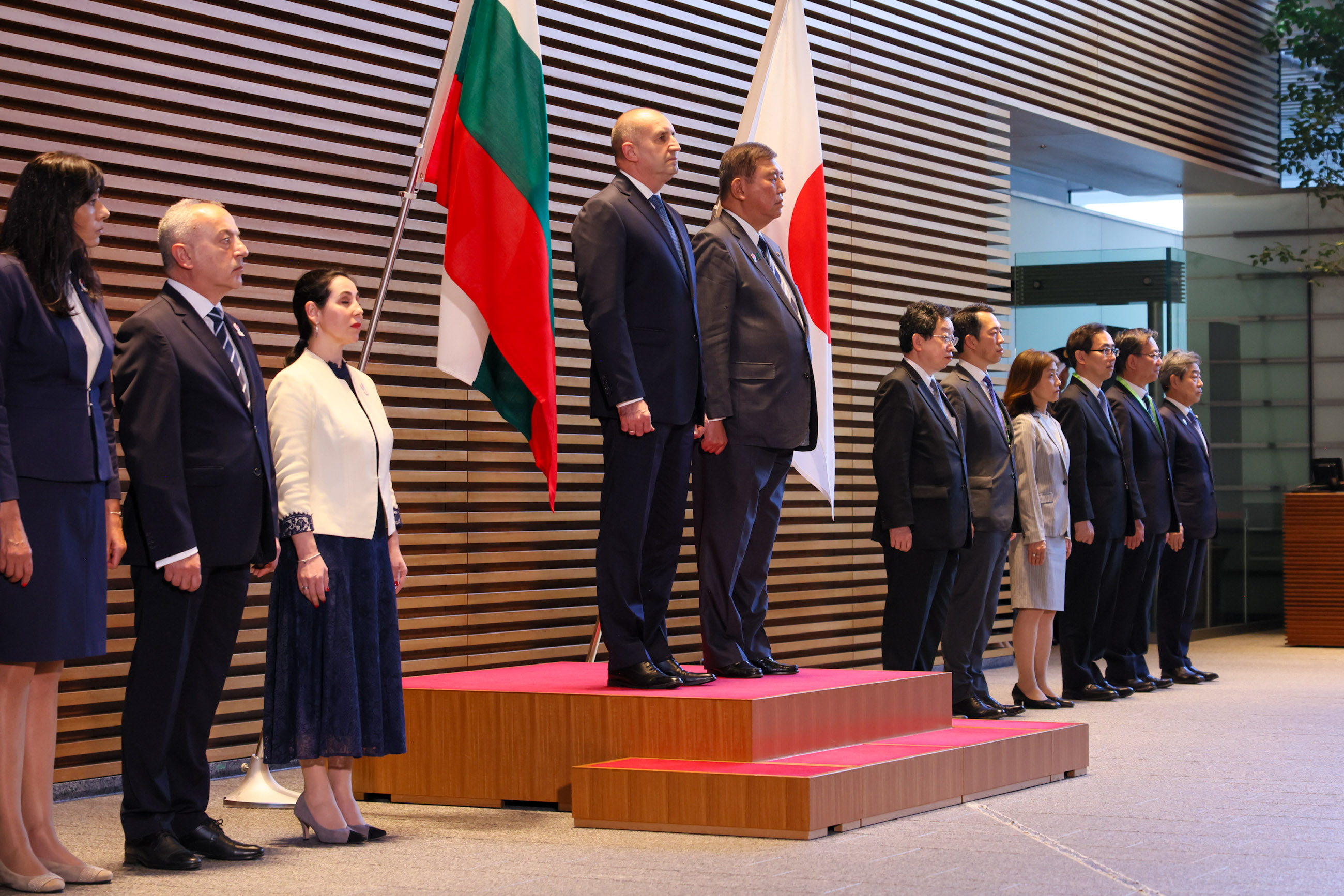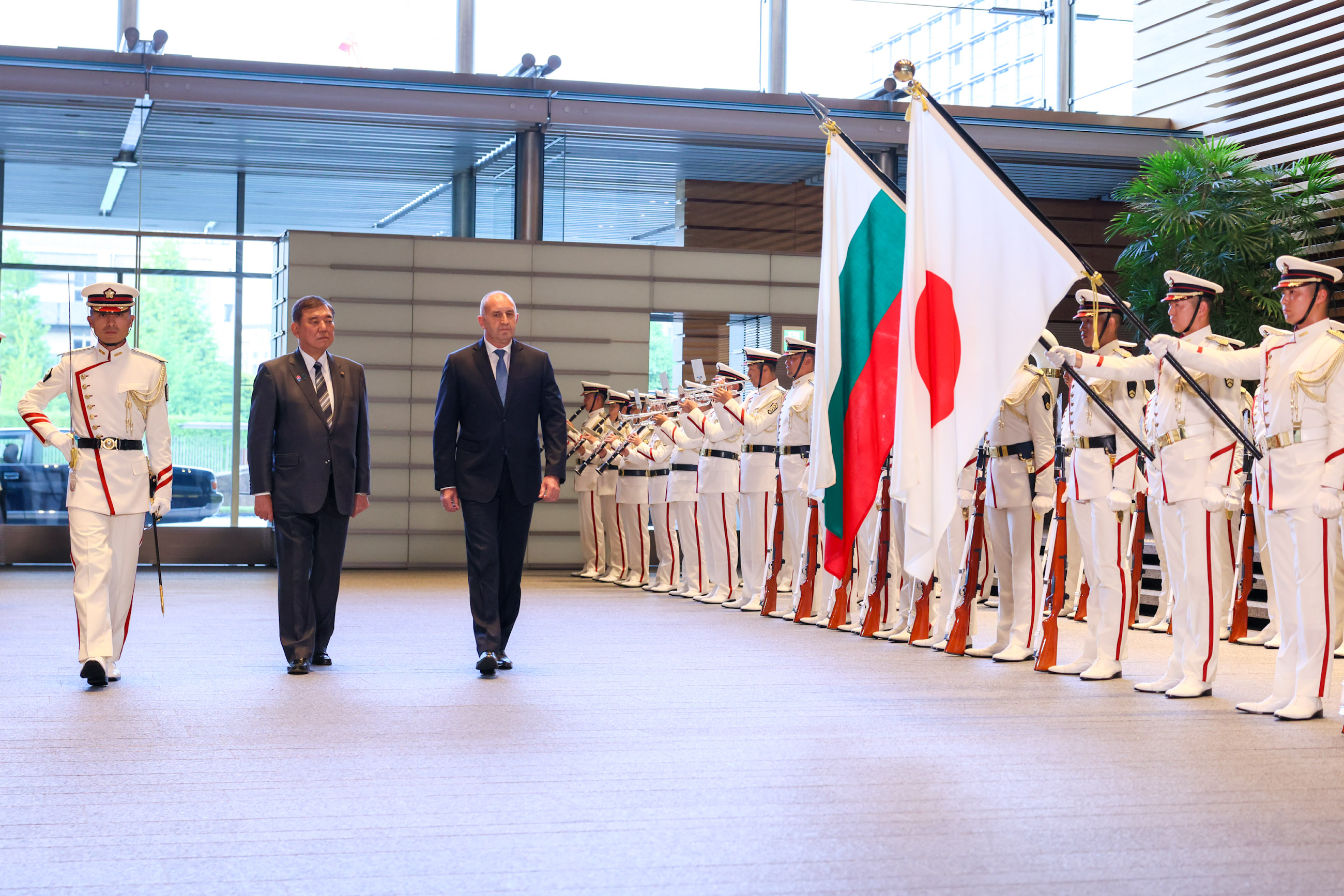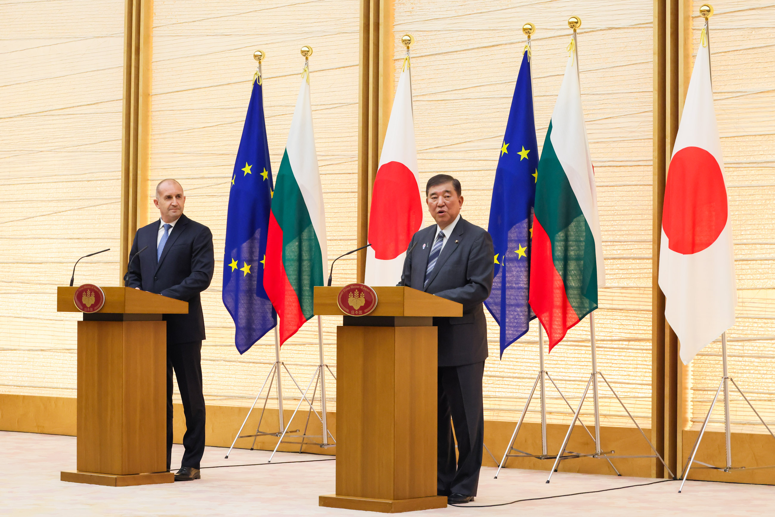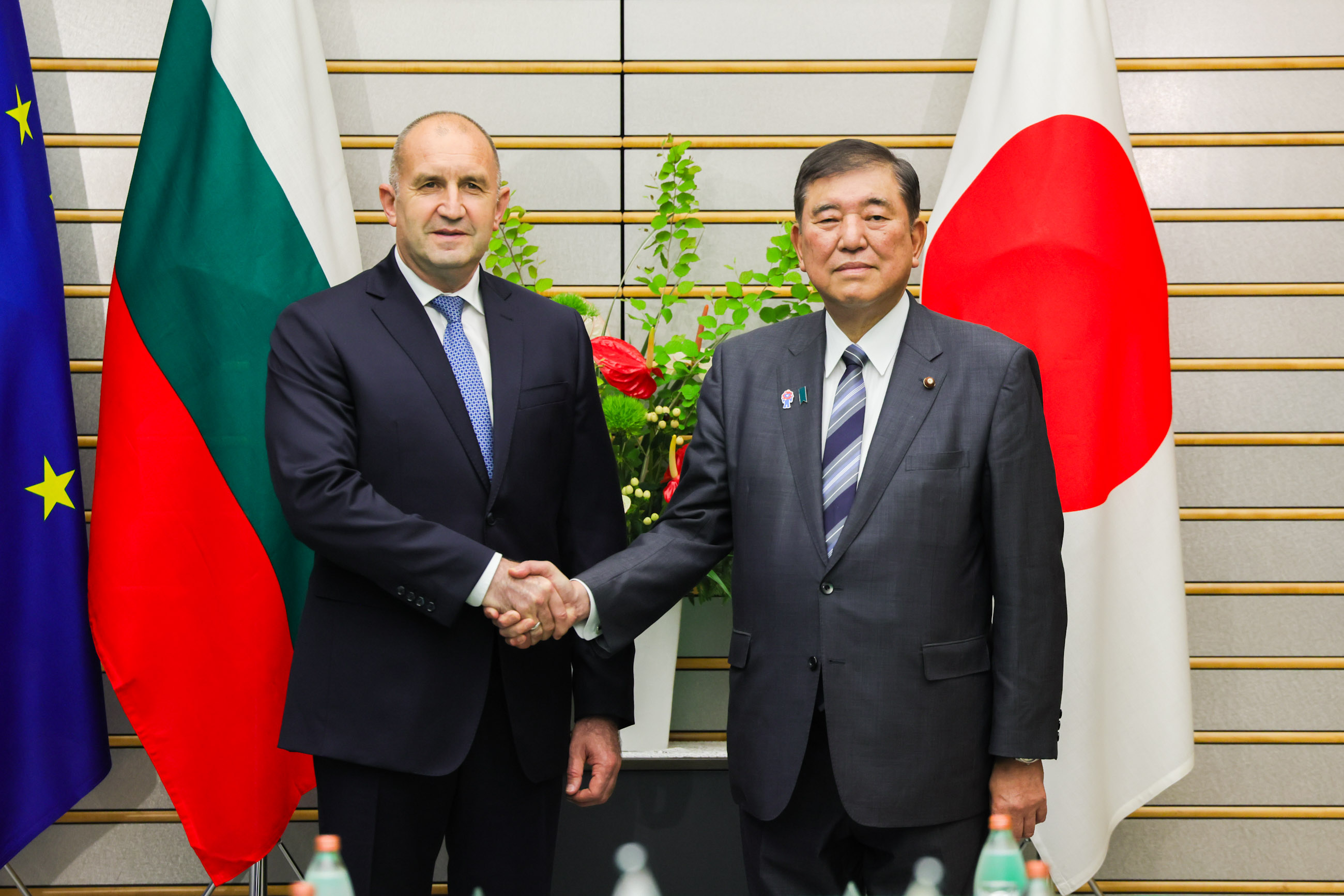 日・ブルガリア首脳会談 更新日:令和7年5月20日 総理の一日 ツイート 共同記者発表1 ラデフ大統領を出迎える石破総理 儀じょう隊による栄誉礼及び儀じょう1 儀じょう隊による栄誉礼及び儀じょう2 儀じょう隊による栄誉礼及び儀じょう3 儀じょう隊による栄誉礼及び儀じょう4 儀じょう隊による栄誉礼及び儀じょう5 日・ブルガリア首脳会談1 日・ブルガリア首脳会談2 日・ブルガリア首脳会談3 日・ブルガリア首脳会談4 日・ブルガリア首脳会談5 共同声明署名式1 共同声明署名式2 共同声明署名式3 共同声明署名式4 共同記者発表2 共同記者発表3 共同記者発表4 共同記者発表5 共同記者発表6 関連動画開く閉じる 動画が再生できない方はこちら(政府広報オンライン) 令和7年5月20日、石破総理は、総理大臣官邸でブルガリア共和国のルメン・ラデフ大統領と首脳会談を行いました。 儀じょう隊による栄誉礼及び儀じょうに続き、両首脳は会談を行い、その後、共同声明署名式及び共同記者発表を行いました。最後にワーキング・ディナーを行いました。