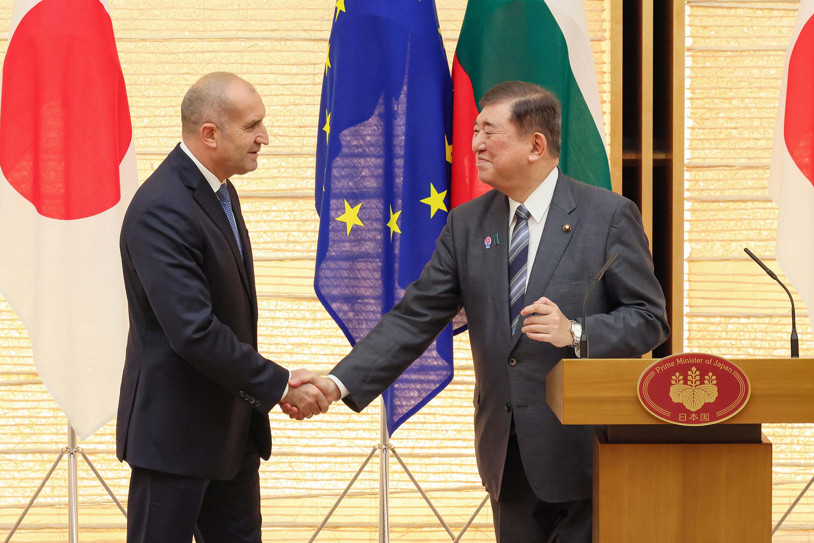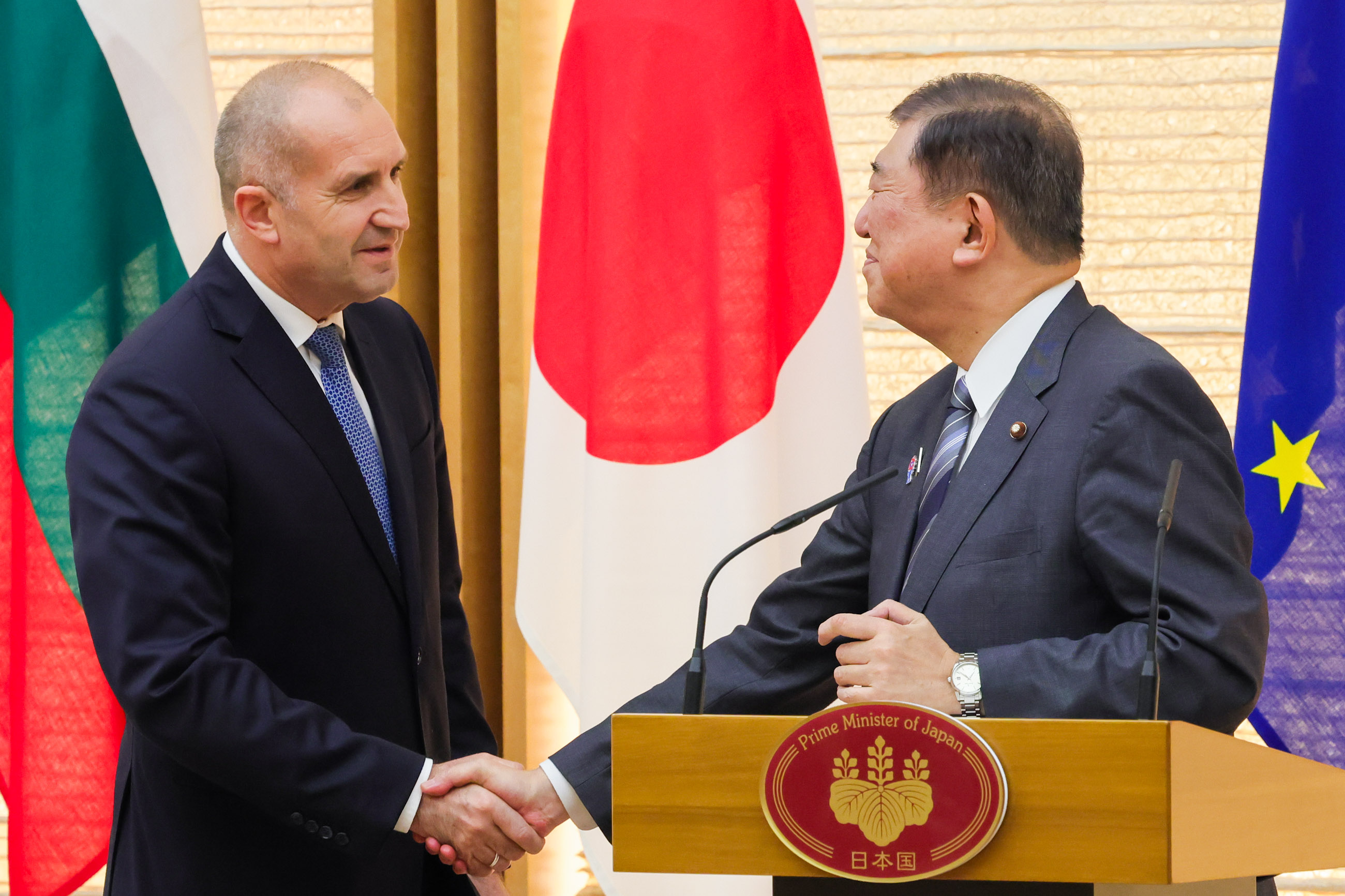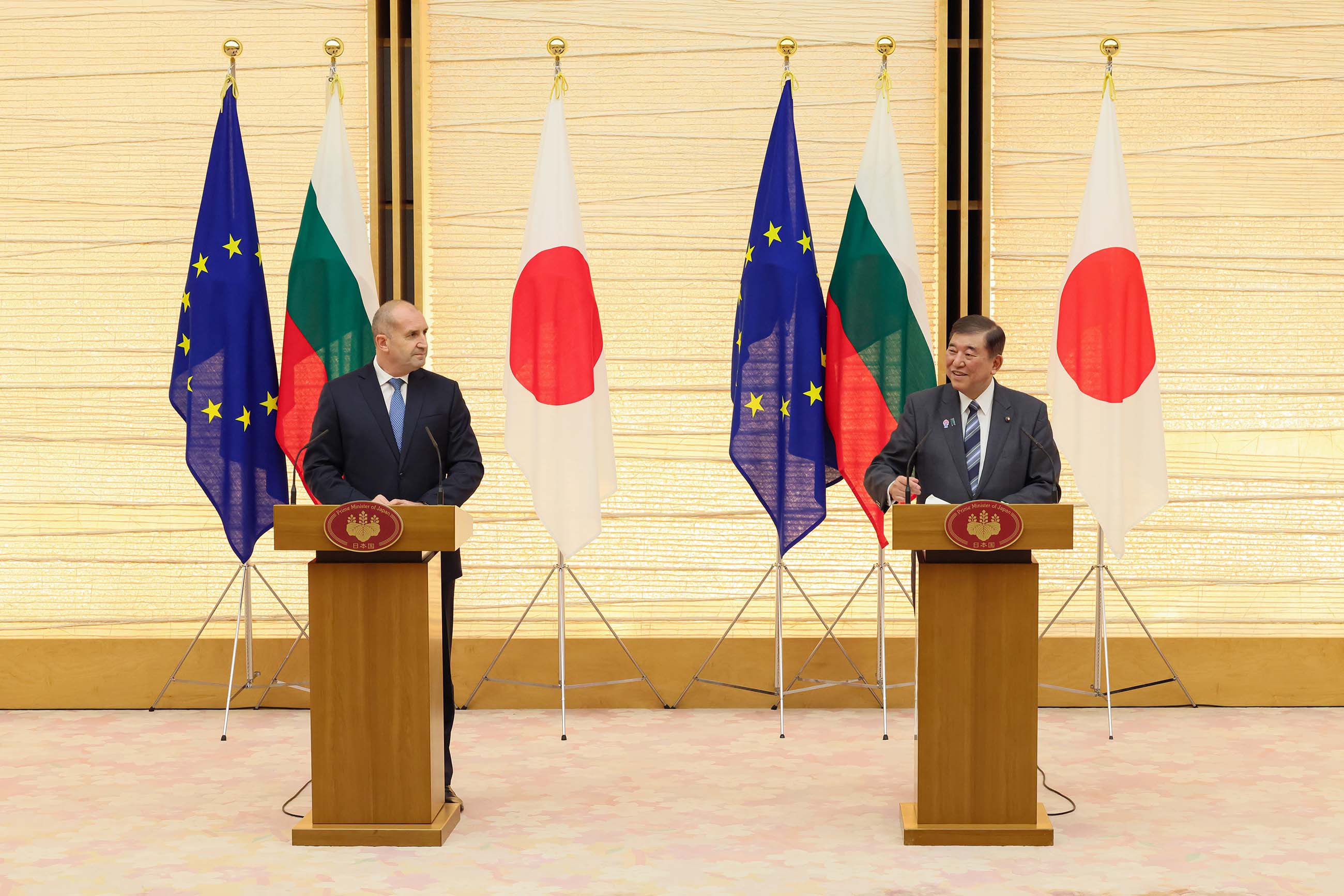 日・ブルガリア首脳会談 更新日:令和7年5月20日 総理の一日 ツイート 共同記者発表1 ラデフ大統領を出迎える石破総理 儀じょう隊による栄誉礼及び儀じょう1 儀じょう隊による栄誉礼及び儀じょう2 儀じょう隊による栄誉礼及び儀じょう3 儀じょう隊による栄誉礼及び儀じょう4 儀じょう隊による栄誉礼及び儀じょう5 日・ブルガリア首脳会談1 日・ブルガリア首脳会談2 日・ブルガリア首脳会談3 日・ブルガリア首脳会談4 日・ブルガリア首脳会談5 共同声明署名式1 共同声明署名式2 共同声明署名式3 共同声明署名式4 共同記者発表2 共同記者発表3 共同記者発表4 共同記者発表5 共同記者発表6 関連動画開く閉じる 動画が再生できない方はこちら(政府広報オンライン) 令和7年5月20日、石破総理は、総理大臣官邸でブルガリア共和国のルメン・ラデフ大統領と首脳会談を行いました。 儀じょう隊による栄誉礼及び儀じょうに続き、両首脳は会談を行い、その後、共同声明署名式及び共同記者発表を行いました。最後にワーキング・ディナーを行いました。
