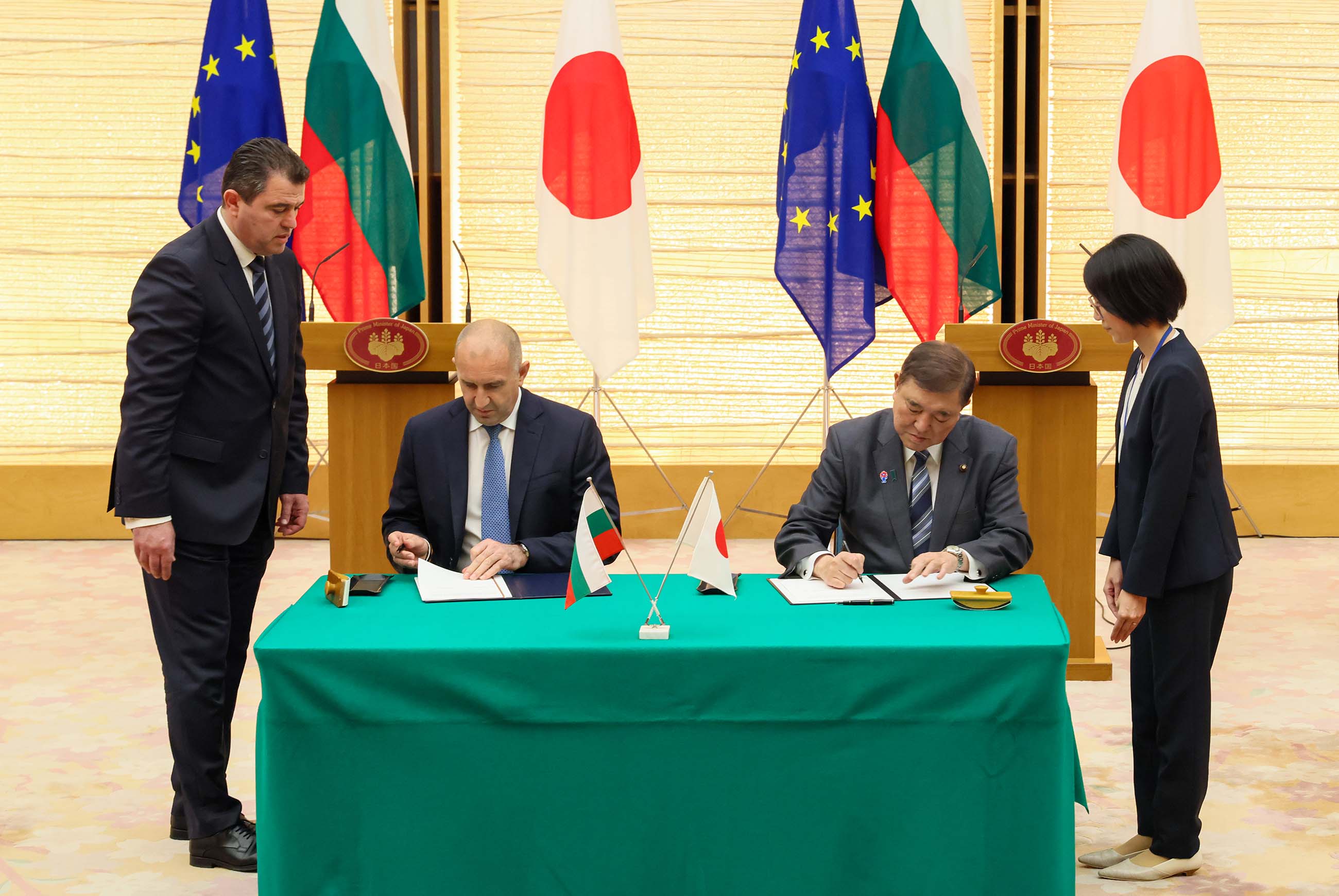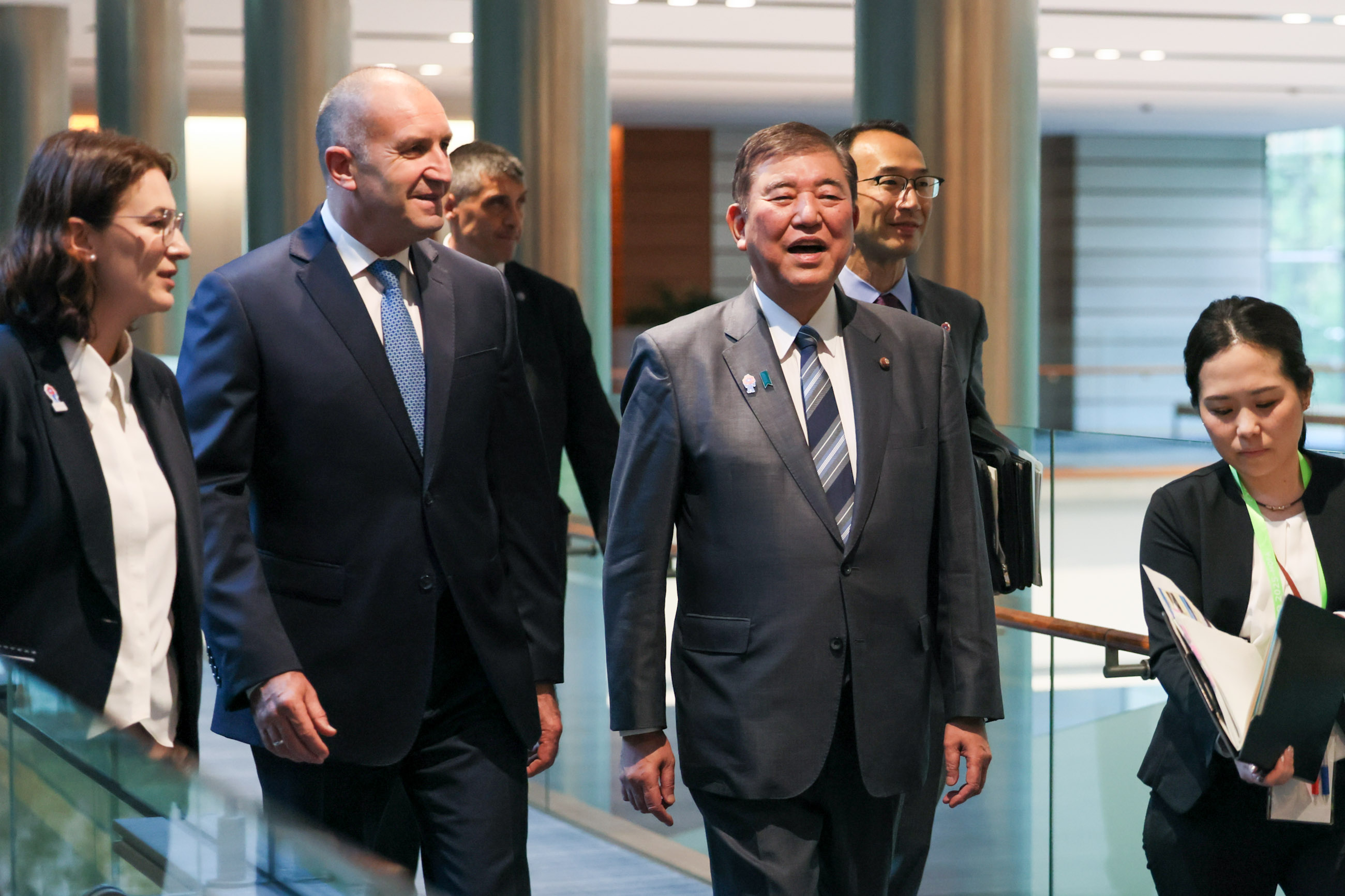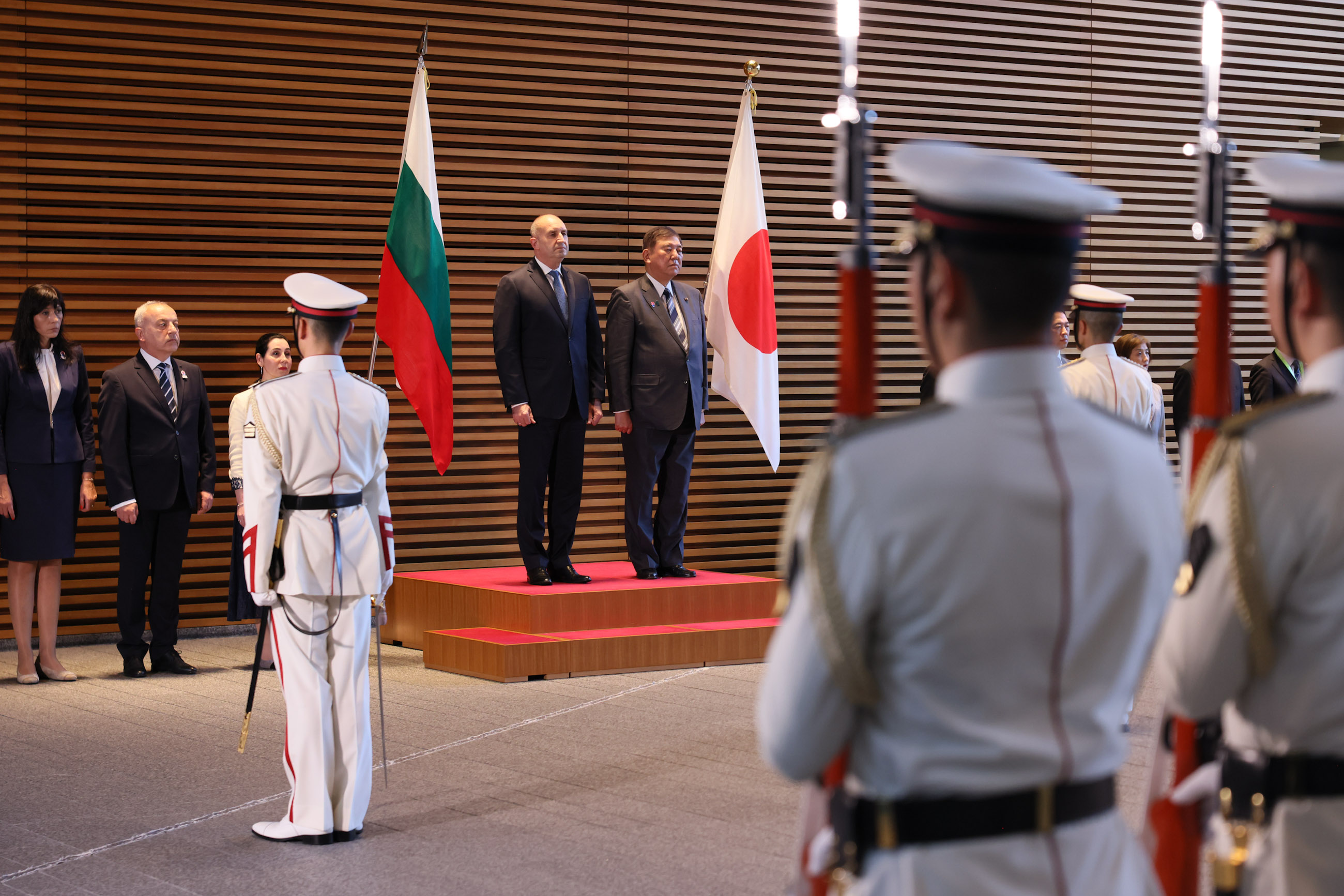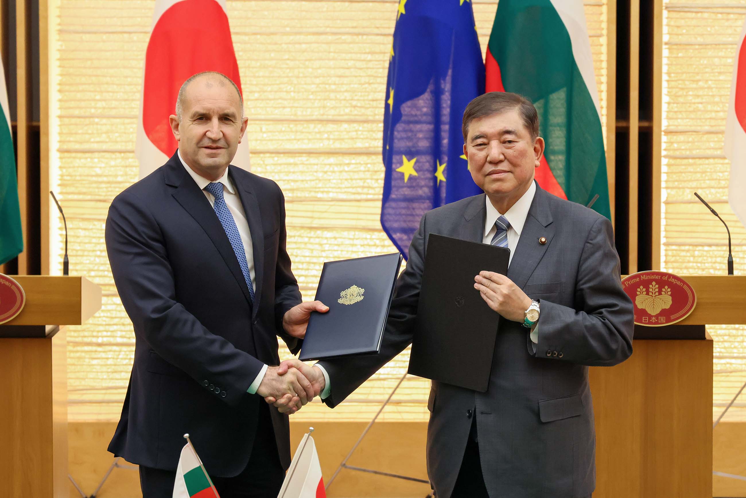 日・ブルガリア首脳会談 更新日:令和7年5月20日 総理の一日 ツイート 共同記者発表1 ラデフ大統領を出迎える石破総理 儀じょう隊による栄誉礼及び儀じょう1 儀じょう隊による栄誉礼及び儀じょう2 儀じょう隊による栄誉礼及び儀じょう3 儀じょう隊による栄誉礼及び儀じょう4 儀じょう隊による栄誉礼及び儀じょう5 日・ブルガリア首脳会談1 日・ブルガリア首脳会談2 日・ブルガリア首脳会談3 日・ブルガリア首脳会談4 日・ブルガリア首脳会談5 共同声明署名式1 共同声明署名式2 共同声明署名式3 共同声明署名式4 共同記者発表2 共同記者発表3 共同記者発表4 共同記者発表5 共同記者発表6 関連動画開く閉じる 動画が再生できない方はこちら(政府広報オンライン) 令和7年5月20日、石破総理は、総理大臣官邸でブルガリア共和国のルメン・ラデフ大統領と首脳会談を行いました。 儀じょう隊による栄誉礼及び儀じょうに続き、両首脳は会談を行い、その後、共同声明署名式及び共同記者発表を行いました。最後にワーキング・ディナーを行いました。