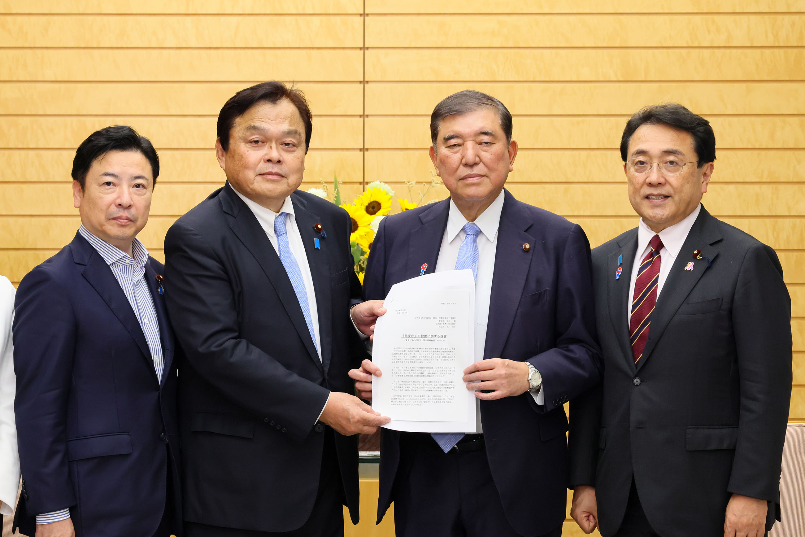 公明党「新たな防災・減災・復興政策検討委員会」及び「復興・防災部会」合同提言申入れ 更新日:令和7年6月4日 総理の一日 ツイート 提言を受け取る石破総理1 提言を受け取る石破総理2 提言を受け取る石破総理3 関連動画開く閉じる 動画が再生できない方はこちら(政府広報オンライン) 令和7年6月4日、石破総理は、総理大臣官邸で公明党「新たな防災・減災・復興政策検討委員会」及び「復興・防災部会」による提言を受け取りました。