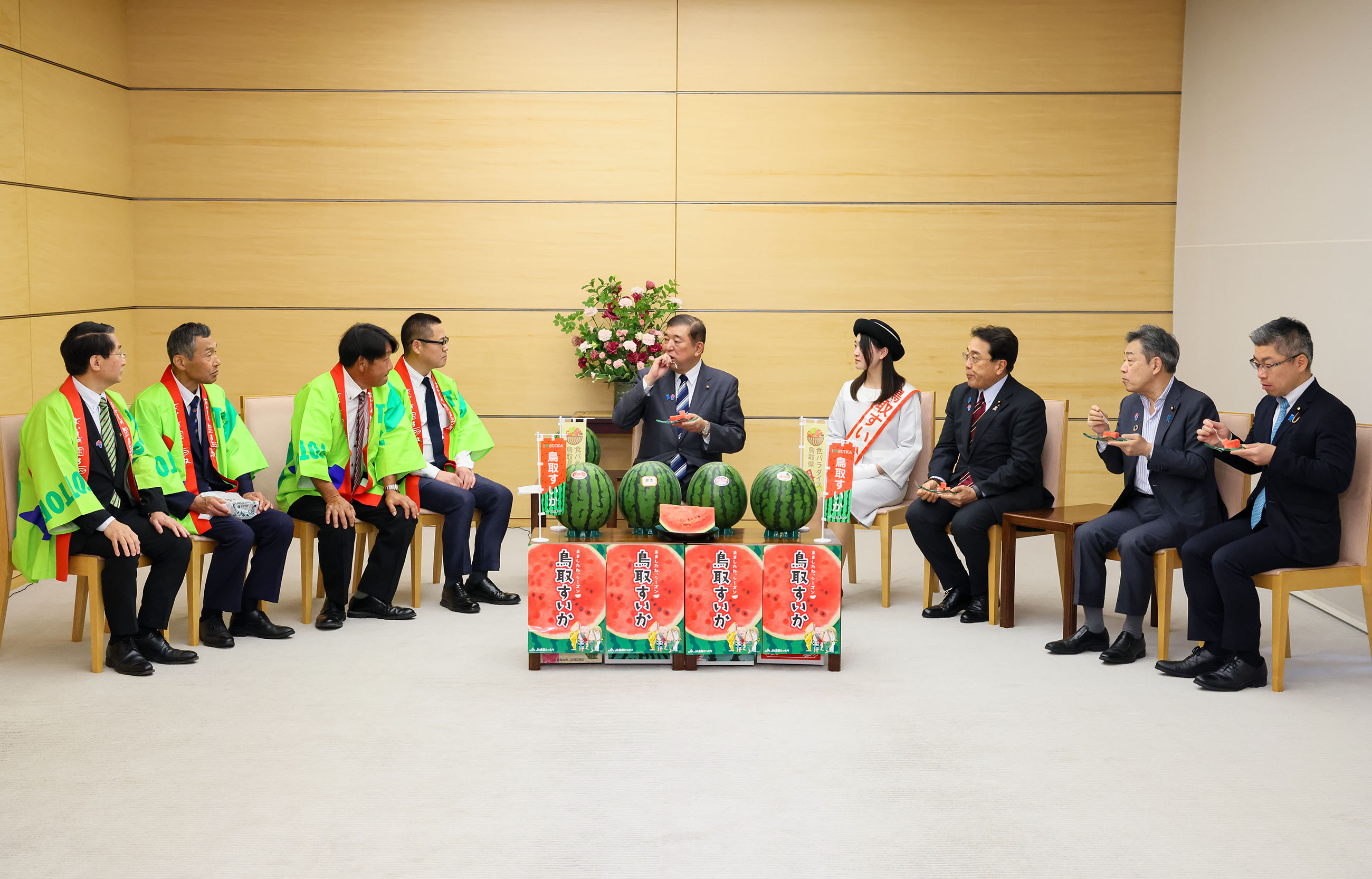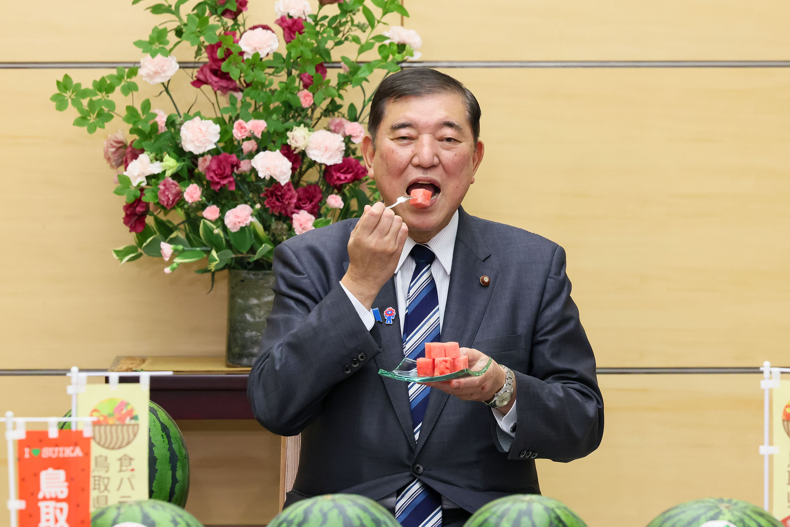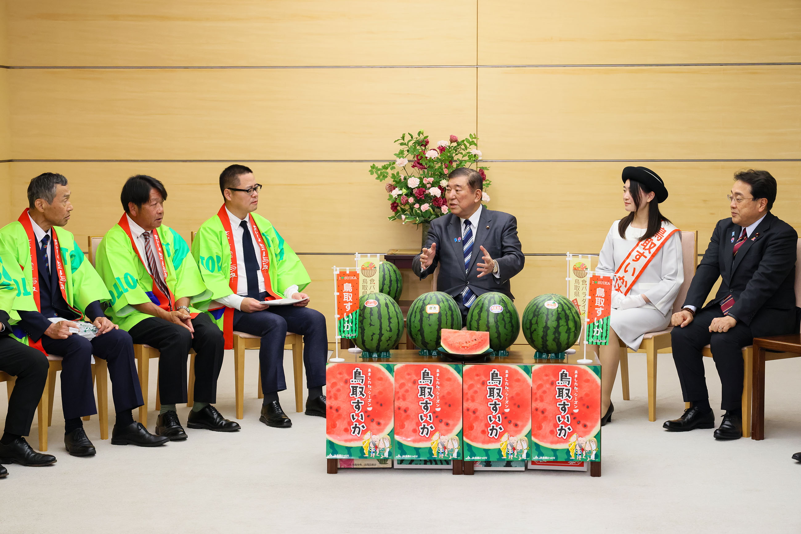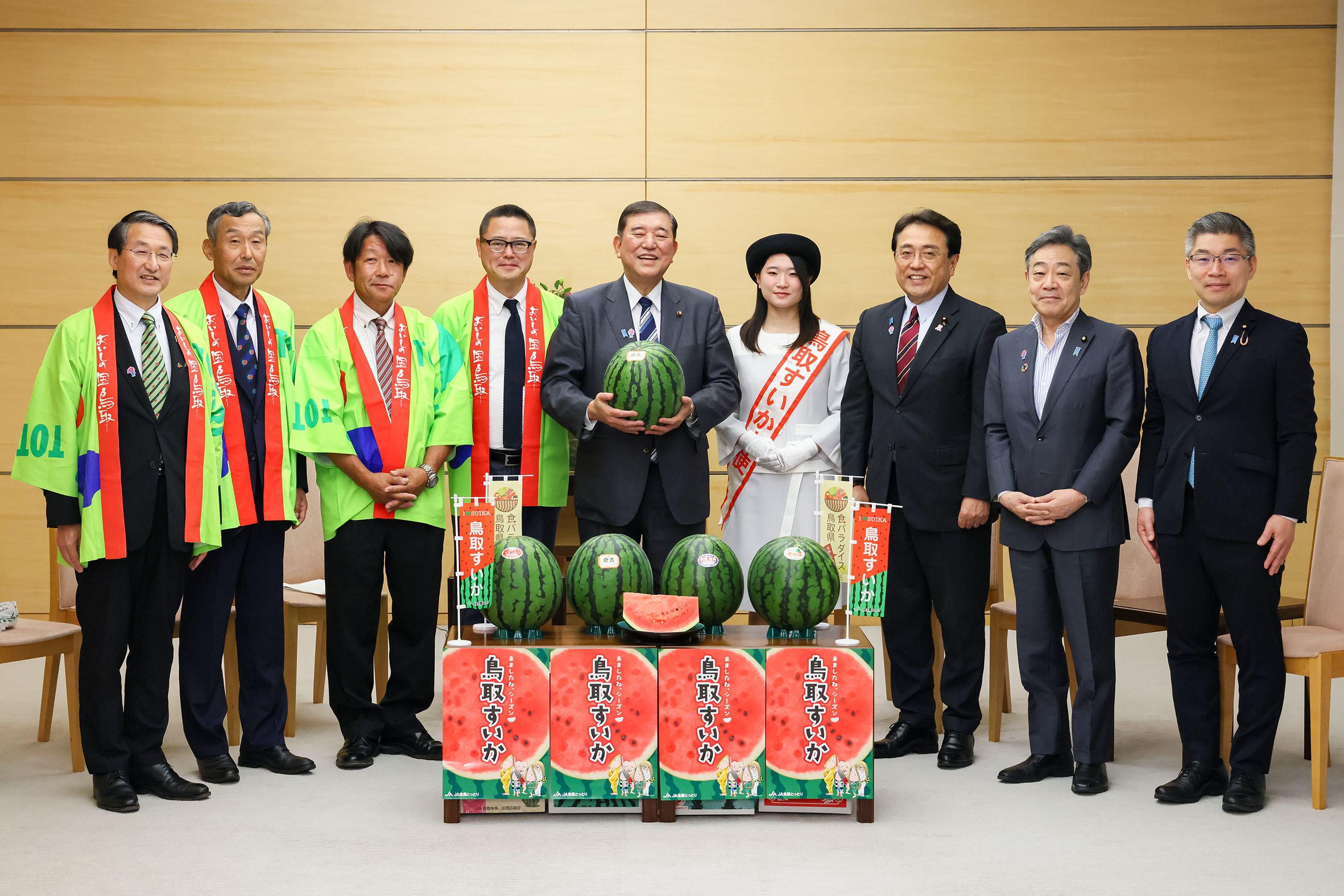 JA全農とっとりによる「鳥取すいか」の贈呈 更新日:令和7年6月10日 総理の一日 ツイート 贈呈を受ける石破総理1 贈呈を受ける石破総理2 贈呈を受ける石破総理3 贈呈を受ける石破総理4 関連動画開く閉じる 動画が再生できない方はこちら(政府広報オンライン) 令和7年6月10日、石破総理は、総理大臣官邸でJA全農とっとりによる「鳥取すいか」の贈呈を受けました。