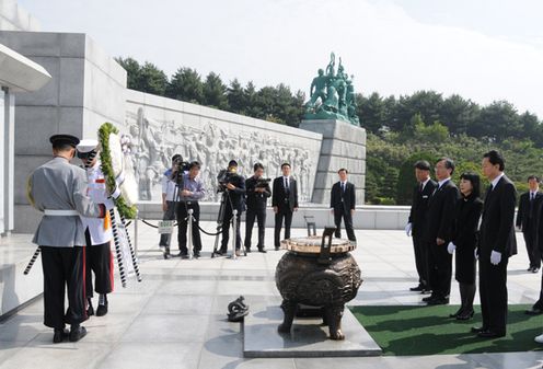 韓国に到着した鳩山総理は、国立墓地の大田顕忠院で献花を行った後、日中韓サミットが開催される済州島を訪れました。