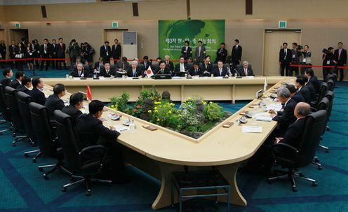 鳩山総理は、韓国の李明博大統領と会談を行い、その後、中華人民共和国の温家宝国務院総理、韓国の李明博大統領とともに日中韓サミットに臨みました。