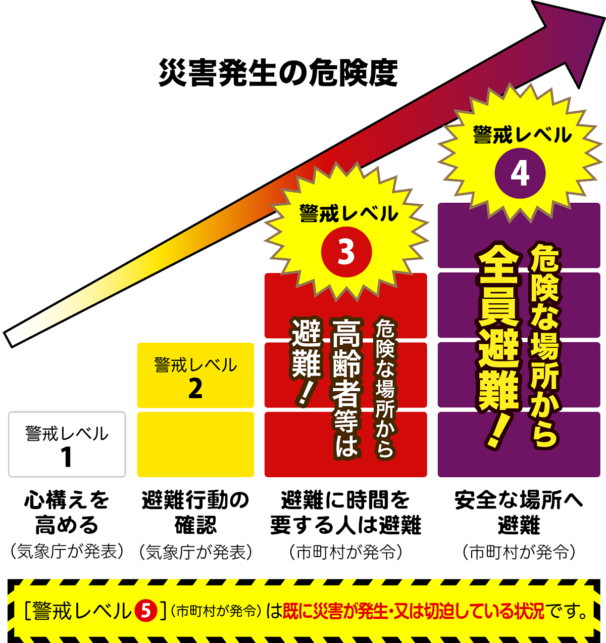 警戒レベル5は、安全な避難が難しい状況です。警戒レベル3、4の段階で地域の皆さんで声を掛け合って、また、空振りをおそれずに、安全・確実に避難を終えましょう。