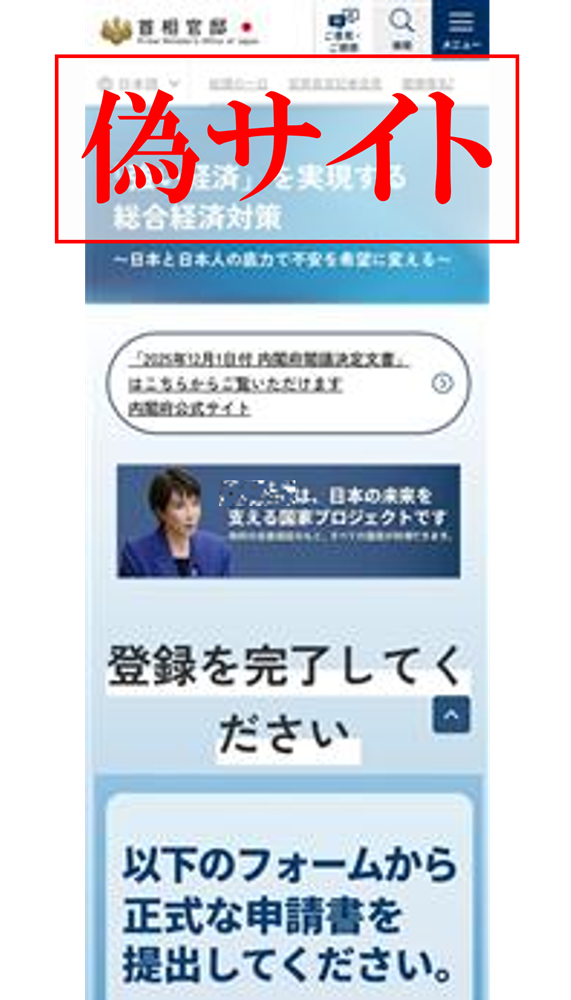 - ・URLや表示内容が官邸サイトに似ていても、偽サイトの可能性があります。