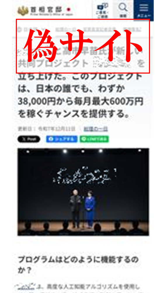 - Q. スマホでSNSを見ていたら、高市総理の映像を使って、投資プロジェクトへの参加を呼び掛ける動画が流れてきました。本物ですか?