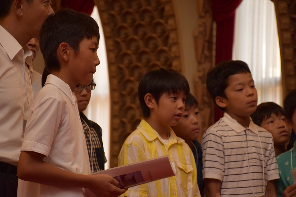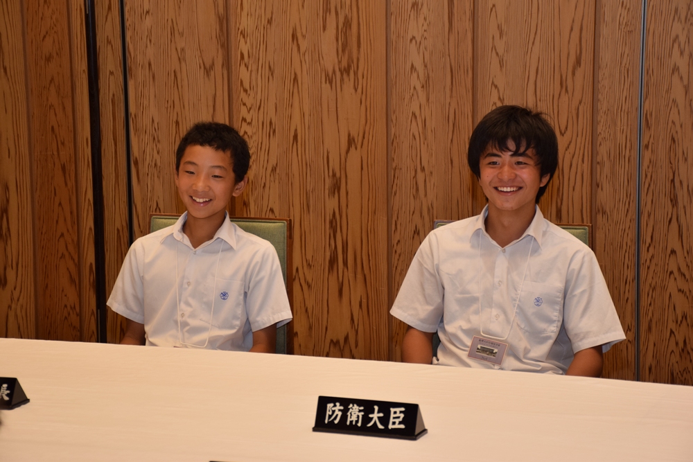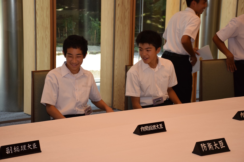 日々、様々な会議が開かれている官邸の小ホール。子どもたちは、大臣の椅子に座って笑顔で会議!