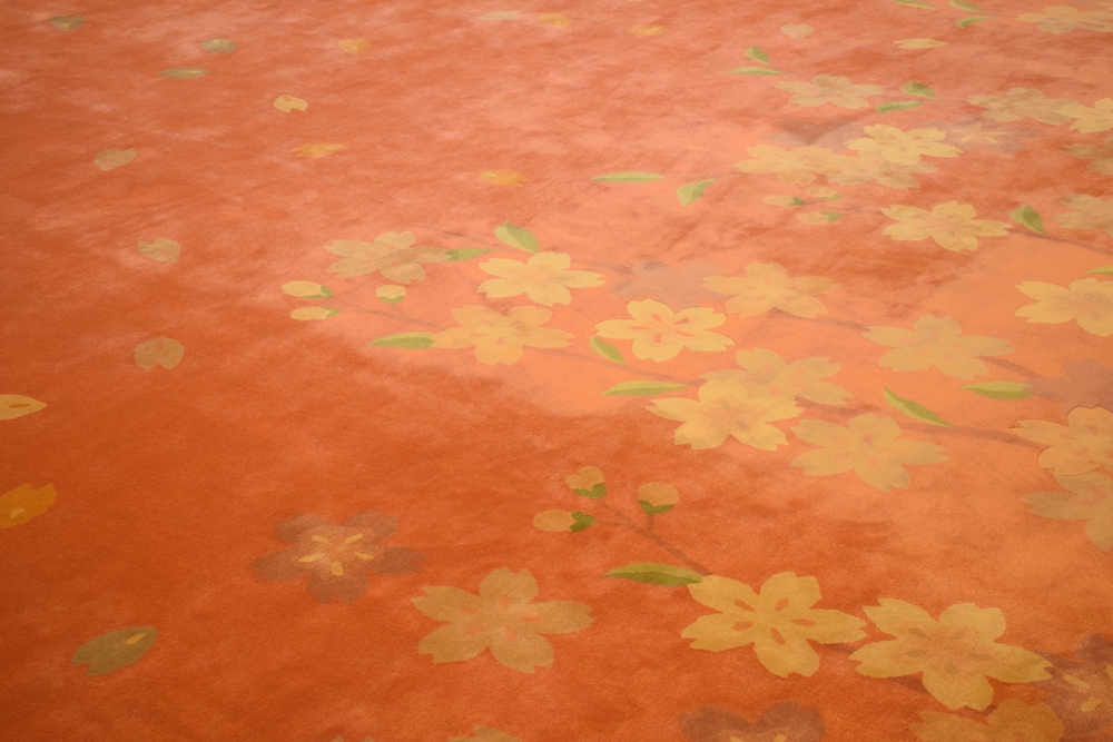ちなみに、大ホールは、小ホールの落ち着いた「秋」のイメージとは対照的に、絨毯に桜があしらわれ、華やかな「春」のイメージ。