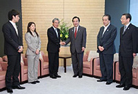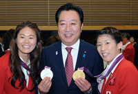 野田総理は総理大臣官邸で、公益財団法人日本オリンピック委員会(JOC)の竹田恒和会長およびロンドン五輪日本代表吉田沙保里選手、立石諒選手による表敬を受けました。