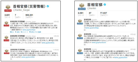 ツイッターの公式アカウント「首相官邸(災害情報)」