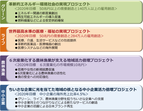 上の重点施策の中でも、今後の国内の需要が見込め、暮らしの向上や経済・地域の活性化などに結びつく3つの重点分野「グリーン」「ライフ」「農林漁業」とそれらの担い手となる「中小企業」を、「日本再生の4つのプロジェクト」と位置づけ、重点的・集中的に施策を実施します。