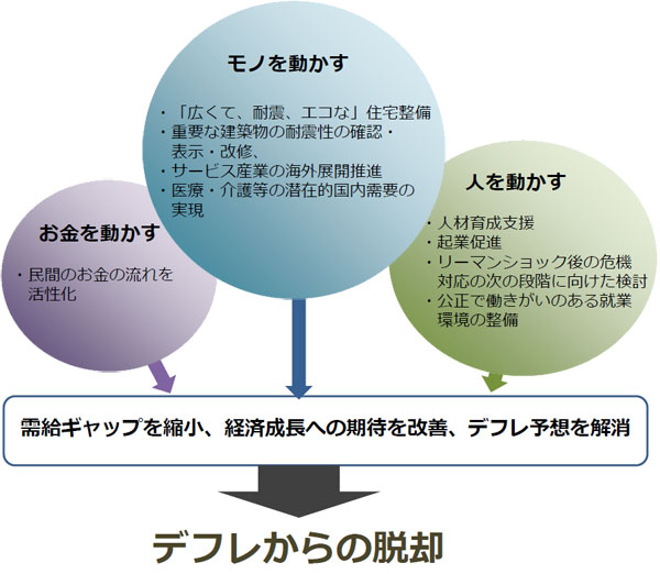 デフレからの脱却については、「モノ」「人」「お金」をダイナミックに動かすため、平成25年度までの2年間で規制・制度改革、予算、税制などさまざまな政策手段を動員。長期にわたるデフレの原因である需給ギャップの縮小、経済成長の期待の改善、デフレ予想の解消につなげます。