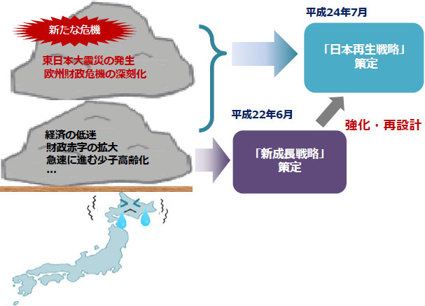 日本再生戦略では、この「新成長戦略」の問題意識はそのまま引き継ぎながらも、同戦略の策定後に新たに発生した危機を踏まえ、その強化・再設計を行いました。