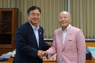 8月20日(木)、JXホールディングス株式会社名誉顧問の渡文明さんが遠藤大臣を訪ね、意見交換を行いました。渡さんは、政府の行政改革推進会議のメンバーであるとともに、民間資金等活用事業推進機構 代表取締役社長も務めています。