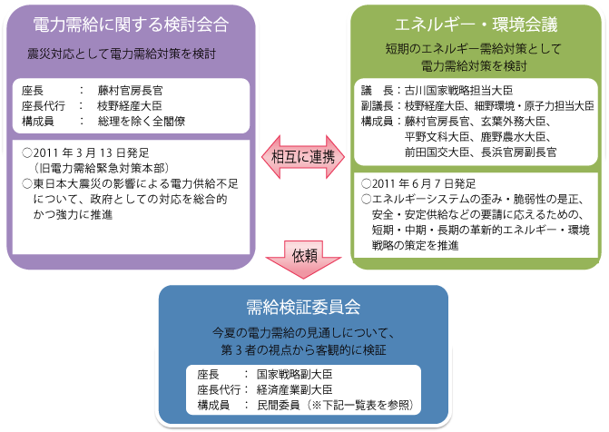 | (1) | 客観的な第3者のチェックによる電力需給の検証を目的として、「エネルギー・環境会議」と「電力需給に関する検討会合」の下に「需給検証委員会」を設置しました。 |