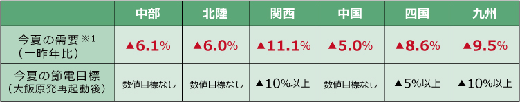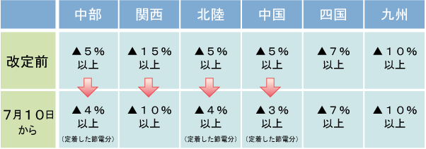 3、4号機が安定的に稼働したことにより、中西日本(中部、関西、北陸、中国、四国、九州電力)において、供給力が増加しました。その結果、各エリアの節電目標を下記の通り改定します。