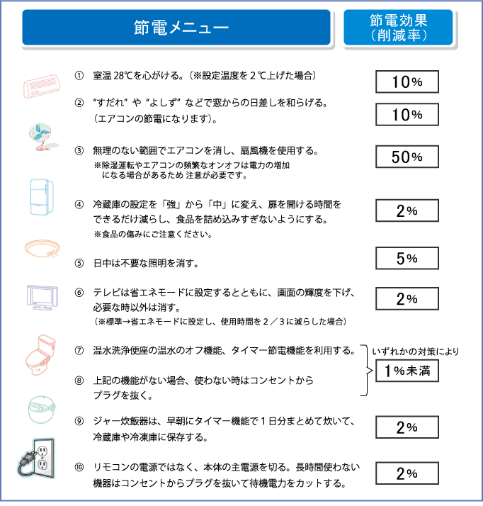 例えば、各ご家庭で以下のような対策を行えば、右に記載されている程度の節電効果が見込まれます。