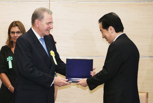 平成23年7月15日、菅総理は総理大臣官邸で、国際オリンピック委員会のジャック・ロゲ会長らから表敬を受けました。