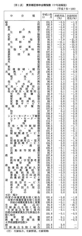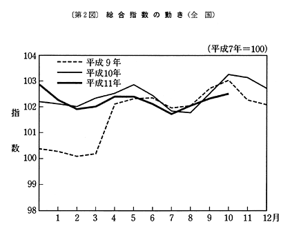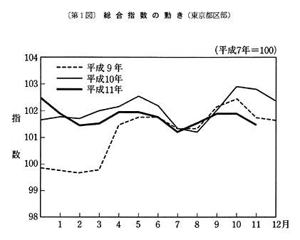 (1) 総合指数は平成七年を一〇〇として一〇一・五となり、前月比は〇・五%の下落。前年同月比は八月〇・三%の上昇、九月〇・一%の下落、十月〇・九%の下落と推移した後、十一月は一・三%の下落となった。