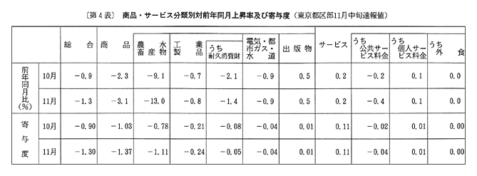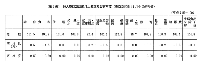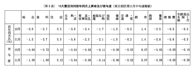東京都区部の動きでみると、生鮮食品を除く総合は、前年同月比で十月〇・二%の下落の後、十一月(中旬速報値)は、繊維製品の下落幅の拡大等により〇・三%の下落(前月比〇・一%の下落)となった。なお、総合は、前年同月比で十月〇・九%の下落の後、十一月(中旬速報値)は昨年の生鮮食品の上昇の影響等により一・三%の下落(前月比〇・五%の下落)となった。