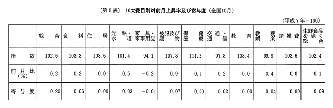 (1) 総合指数は平成七年を一〇〇として一〇二・六となり、前月比は〇・二%の上昇。前年同月比は七月〇・一%の下落、八月〇・三%の上昇、九月〇・二%の下落と推移した後、十月は〇・七%の下落となり、下落幅は前月に比べ〇・五ポイント拡大。これは、生鮮野菜が前年の価格水準を下回ったことなどによる。