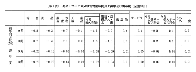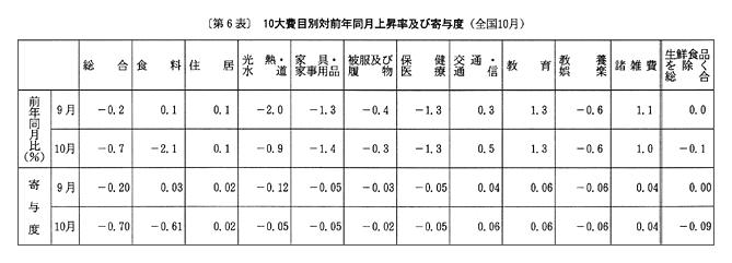 生鮮野菜(三〇・〇%下落)、生鮮果物(一六・〇%下落)、衣料(二・六%下落)、教養娯楽用品(三・三%下落)