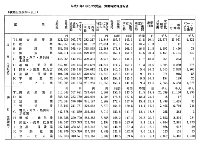 十一月の調査産業計の常用労働者一人平均月間現金給与総額は二十九万四千九円、前年同月比は一・〇%減であった。現金給与総額のうち、きまって支給する給与は二十八万二千九百六十九円、前年同月比〇・二%増であった。これを所定内給与と所定外給与とに分けてみると、所定内給与は二十六万四千二百五十二円、前年同月比〇・一%減、所定外給与は一万八千七百十七円、前年同月比は五・七%増であった。