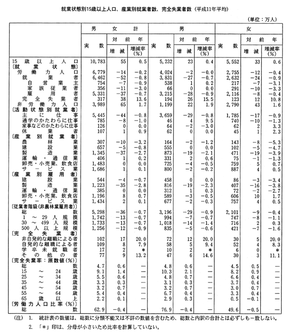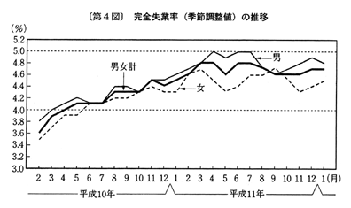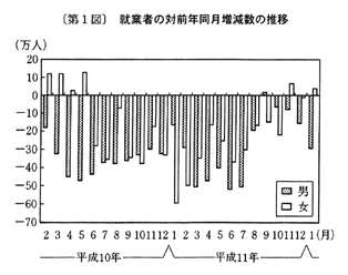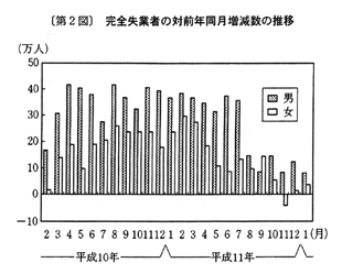 平成十一年平均の完全失業者数は三百十七万人となり、前年に比べ三十八万人増加し、比較可能な昭和二十八年以降初めて三百万人を超えた。ただし、増加幅は平成十年(四十九万人)より縮小している。男女別にみると、男性は百九十四万人、女性は百二十三万人で、男女ともに過去最多となっている。月別にみると、男性は八月以降増加幅が縮小傾向にある。女性は四月以降増加幅が縮小傾向にあり、十一月は前年同月を下回っている。