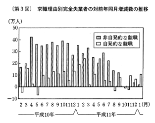 「非自発的な離職による者」は前年に比べ十七万人増加したが、平成十年(三十一万人増)よりも増加幅は縮小した。平成十一年の月別の動きをみると、「非自発的な離職による者」は十月以降は前年とほぼ同じ水準となっている(第9図参照)。