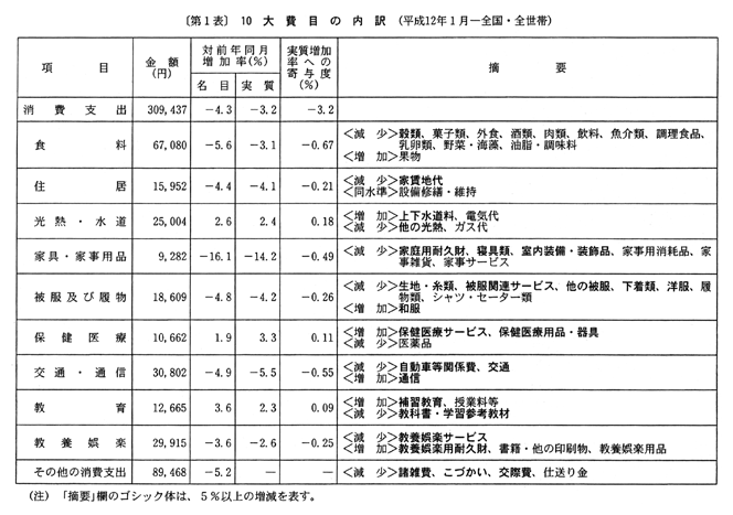 (1) 全世帯の消費支出を基礎的支出と選択的支出に区分してみると、家賃地代、保健医療サービスなどの基礎的支出は、一世帯当たり一か月平均十八万一千七百七十六円で、前年に比べ実質〇・一%の増加となった。また、教育、洋服、パソコン・ワープロなどの教養娯楽用耐久財、国内・外国パック旅行費などの教養娯楽サービス、仕送り金などの選択的支出は十四万一千二百三十二円で、実質二・八%の減少となった。