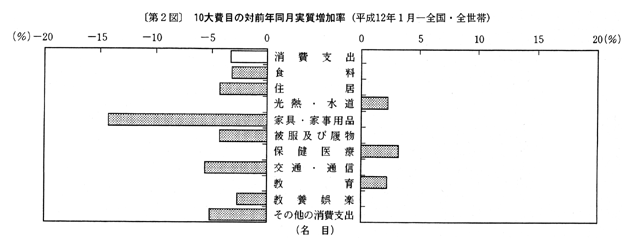 一方、被服及び履物(実質八・九%減)が大幅な実質減少となったほか、食料(同一・五%減)も実質減少となった(第2図参照)。