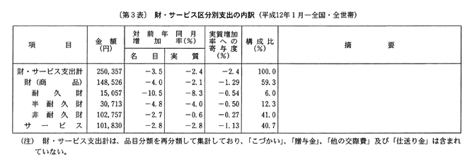 また、パソコン・ワープロなどの教養娯楽用耐久財、国内・海外パック旅行費などの教養娯楽サービス、仕送り金などの選択的支出は七万六千円で実質二・九%の増加となった。