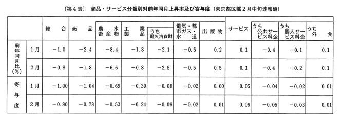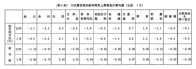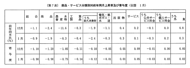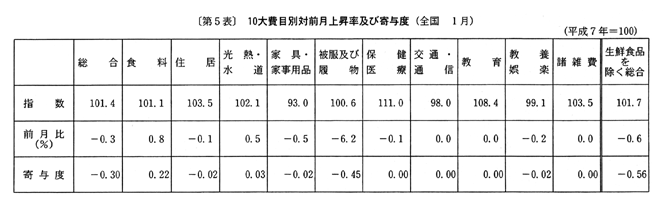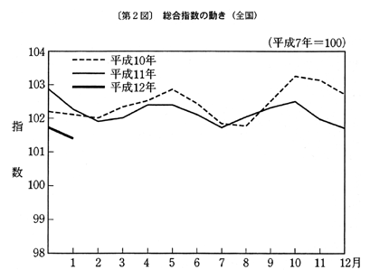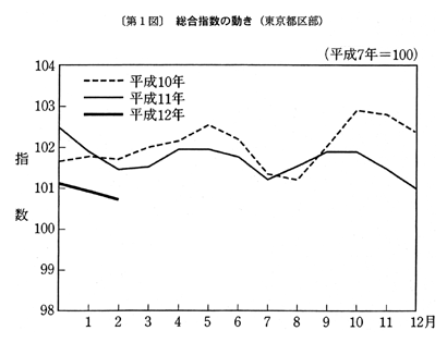 (1) 総合指数は平成七年を一〇〇として一〇一・四となり、前月比は〇・三%の下落。前年同月比は十月〇・七%の下落、十一月一・二%の下落、十二月一・一%の下落と推移した後、一月は〇・九%の下落となった。