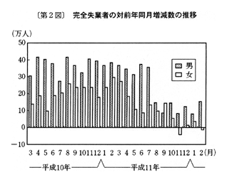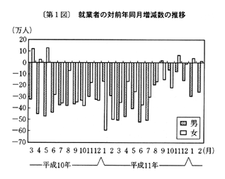 ○臨時雇…五百十三万人で、一万人(〇・二%)増、平成八年九月以降、増加が継続