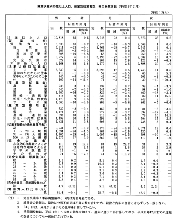 平成十二年二月末の十五歳以上人口は一億八百十八万人で、前年同月に比べ五十五万人(〇・五%)の増加となっている。これを就業状態別でみると、就業者は六千三百十一万人、完全失業者は三百二十七万人、非労働力人口は四千百六十八万人で、前年同月に比べそれぞれ二十三万人(〇・四%)減、十四万人(四・五%)増、六十五万人(一・六%)増となっている。