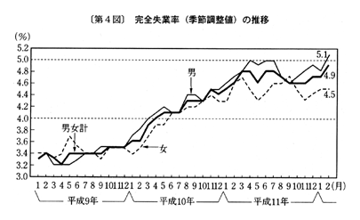 完全失業率(労働人口に占める完全失業者の割合)は四・九%で、前年同月に比べ〇・二ポイントの上昇となっている。男女別にみると、男性は五・一%で、〇・四ポイントの上昇、女性は四・六%で、前年同月と同率となっている。
